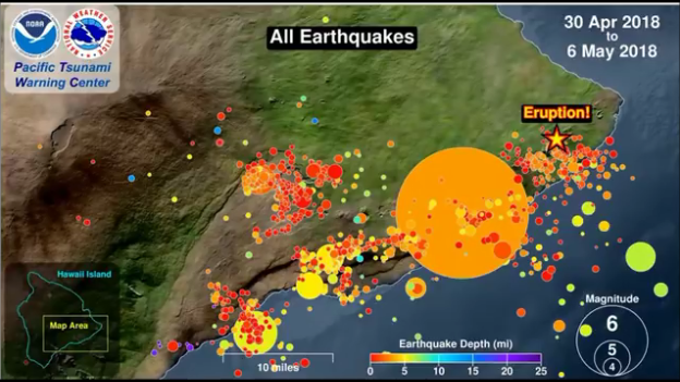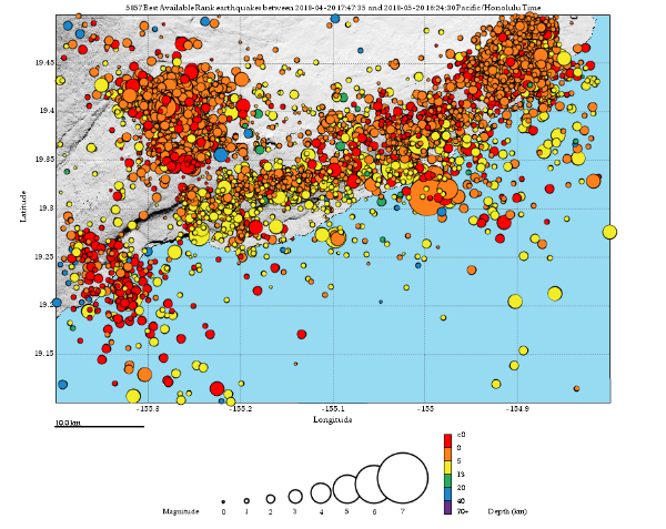 | 2771 Date: 2018-05-17 (Thu) キラウエア火山噴火は激化するのだろうか キラウエア火山の噴火警戒レベルが最高レベルになり、航空機への支障も心配され始めました。 ーーーーーーーーーーーーーーーーーーーーーーーーーーーーーーーーーーーーーーーーーーーーーーーーー ハワイの火山、警戒レベル引き上げ 航空機に支障の恐れ ![]() キラウエア火山の警戒レベル引き上げで噴煙を見る人々。航空機に支障の恐れも 今回の噴火では、これまでに21カ所で亀裂が生じ、溶岩や有毒ガスの二酸化硫黄が噴出している。ハワイ郡当局は、一部地域では有毒ガスが危険なレベルに達していると述べ、窒息や呼吸困難などの症状を引き起こす恐れもあると指摘。もしも異変を感じたらすぐにその場を離れ、医療機関を受診するよう住民に呼びかけた。 21カ所の亀裂のうち、17番目の亀裂は最も大きく、溶岩が30メートルを超す高さにまで噴き出している。 住宅地を襲った溶岩は民家や車両を次々にのみ込み、これまでに少なくとも37棟の建物が破壊された。 溶岩や有毒ガスに加え、大規模噴火にも警戒する必要がある。火口内の溶岩湖は今月2日以来、沈下を続けており、水蒸気爆発が起きる可能性が高まっている。 ハワイ火山観測所の専門家によると、水蒸気爆発は予測が極めて難しく、何の兆候もなく起きる恐れもある。 ーーーーーーーーーーーーーーーーーーーーーーーーーーーーーーーーーーーーーーーーーーーーーーー 報道記事では、火山灰の放出が強まった理由は分からないとしていますが、マグマの表面よりも深い所で(解離ガスの)爆発が起きていることが考えられます。水蒸気の気化爆発(水蒸気爆発)ならば、白い噴煙が上がるはず。 また、本日発表の地震分布図(24時間内地震)を見ると小さい地震ですが、火口付近に集中している事がわかります。