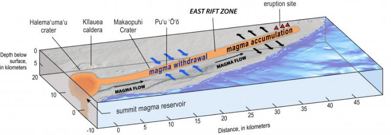 | 2786 Date: 2018-06-01 (Fri) キラウエア火山一帯のマグマの動きについての考察 Hawaiian Volcano Observatory(HVO)の解説で、亀裂から噴出するマグマは溶岩湖の中心部から地殻内部の空隙を通って流れている、という解釈がしてあります。「宏観亭見聞録」でも「マグマの通り道」として紹介しています。 しかし、地震爆発論の解釈([2762]など参照)とは違うようですので、解説を加えておきます。 まずは、5月29日と24日の記事を紹介します。 ーーーーーーーーーーーーーーーーーーーーーーーーーーーーーーーーーーーーーーーーーーーーーーーーー Why so many earthquakes in the Kīlauea summit area? Ground- and space-based monitoring reveal where magma has moved under Kilauea Volcano Small explosive episodes at Kilauea's summit are a consequence of magma withdrawing from a shallow reservoir beneath the east margin of Halema‘uma‘u. The eruption of lava along the LERZ resulted from the underground movement of magma eastward from the volcano's middle East Rift Zone. ![]() Illustration of Kīlauea Volcano from the summit caldera to the lower East Rift Zone (LERZ). Blue arrows = contraction across the upper and middle rift zone, black arrows = expansion in LERZ. Subsidence of the summit area continues. Between May 1 and May 24 the caldera floor subsided as much as 1.4 m (4.5 ft). The GPS station, labeled as CRIM on the edge of Kilauea's summit caldera [Fig.2], has subsided about 0.6 m (1.9 ft). Continued summit subsidence indicates that magma is moving from the summit magma reservoir and into the East Rift Zone at a higher rate than magma is entering the reservoir from below. To date, geochemical analysis of erupted lava indicates that summit magma has not yet erupted from the LERZ fissures 1-23. ーーーーーーーーーーーーーーーーーーーーーーーーーーーーーーーーーーーーーーーーーーーーーーーーーーー 4月30日にプウオオ火口の崩落があってから、頂上火口のマグマレベルも、325m以上低下しています。解釈ではこの付近の低下したマグマは東側の薄い板状の空隙の中を流れて移動していると考えています。 「宏観亭見聞録」では活動中のキラウエアではみることができないが、冷却すれば同じようなものが見られるはずだとして、岩脈の例が紹介してあります。 ![]() This photograph from northwestern New Mexico shows a ridge roughly 30 feet (about 10 meters) tall that formed from lava filling an underground fracture then resisting erosion better than the material around it did. また、薄い板状の空隙を通して粘性の高いマグマが流れるものでしょうか、疑問が残ります。 ところで、[2785]に「紹介したように亀裂F17からはシリカ成分の高いマグマが噴出していますから、HVOの図が示すような一方向(東向き)の流れでは、中間部分にだけ性質の違うマグマが噴出する理由を説明できません。 次に石田理論で考察するマグマの挙動を推定します。 ![]() 熔岩湖のマグマが、板状の空隙を通って東方に流れるというHVOの解釈では、 亀裂F17から異質のマグマが噴出することを説明できない。 地下のマグマは毛細血管や動脈瘤のような構造の内部を移動していると考えられる。 「magma withdrawel」が起きたのは、5月4日のM6.9地震の引き領域になったからであり、東部の亀裂から噴出しているのは、押し領域になったからであって、「magma accumulation」(蓄積)というのは合理的な説得性がありません。 引き領域に当たる部分のマグマは全体的にはM6.9地震の震源に向かって移動しますが、東斜面内の板状の地下空間を流れて噴出しているのではないと考えます。 岩脈の例を見ても、マグマが水平方向に流れた形跡はありません。群発地震的に起きている小地震の押し領域に当たるために、下部からマグマが貫入していることが推定できます。 板状になるのは、M6.9地震で発生した、水平左ずれ断層による亀裂ができたためであり、その亀裂に向けて地下のマグマが貫入したからです。 熔岩湖からマグマが水平に移動するのなら、亀裂から異質なマグマ(シリカ成分が高い)が噴出することを説明できません。亀裂F17付近の地下には安山岩や花こう岩のようなシリカ成分に富む岩石が融解してマグマプールを作っている可能性があります。 F17近くにある地熱発電所で2005年にデイサイトマグマまで掘り進んだというのは([2585])、そのマグマプールまでドリルで掘り下げたという事でしょう。地下内部ではマグマが水平方向にだけ移動しているわけじゃないことを証明しているのではないでしょうか。 毛細血管や動脈瘤の様な構造の内部を移動しているものと思われます。 |