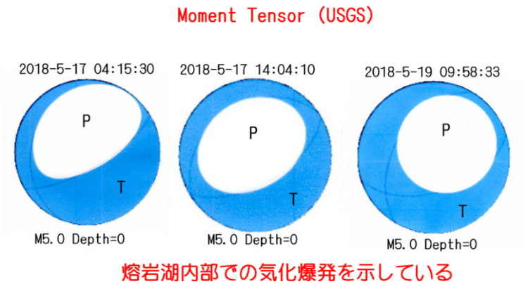 | 2774 Date: 2018-05-20 (Sun) M5.0の火山爆発が教える地震と火山噴火の真相 キラウエア火山の爆発は、終息を見せず、まだまだ激しくなっています。 亀裂からの熔岩流出は海岸まで達するような勢いで、熔岩流に囲まれた住民をヘリコプターで救出する騒ぎになっています。(注:参考) ![]() USGSのMAP より 4日に発生した震源深さ2.1kmのM6.9地震は[2757]で紹介したように“押し円錐”の軸が傾斜した通常(地震爆発論)の地震メカニズムで説明可能です。 いっぽうで、17日(2回)と19日に発生したM5.0地震(USGSの発表ではVolcanic Explosionとなっている)では引き円錐([1653]「引き円錐」になる特殊なケースで解説)のようなCMT解(目玉焼き型と表現している人もいる)になっています。 ![]() TをTension、PをPressureと考えるところからやり直すべきです。 石本理論に戻し、Tの部分を押し(Compression)、Pの部分を引き(Dilatation)とすべきです。 ![]() 押し円錐理論が否定された一因は引き円錐を説明できなかったからです。 しかし、円盤状のマグマ溜り内での解離爆発を想定すれば、引き円錐も説明可能です。 つまり、熔岩湖という天井が存在しないマグマ溜まりのなかでは気化爆発が主要な現象となるので、物理現象としては“引き円錐”と同じような「押し・引き」メカニズムになると推定できます。 ![]() 熔岩湖内での気化爆発を示す“引き円錐”の概念図 今回3回のM5.0に相当するVolcanic ExplosionのCMT解が得られたことを契機として、地震学者と火山学者には、「地震現象と火山噴火現象は同じもの」というフンボルトの認識に戻っていただきたいと願っています。 なお、S氏からの私信によれば、M6.9地震が火山性地震としては大きすぎる件、プレートの潜り込みなどとは無関係のキラウエア火山近辺でも断層地震が起きるものか、などの疑問点を学者諸氏に質問されているそうです。私の感想では返信を期待できそうになく、黙秘権(?)が行使されるのではないかと思っています。 参考: キラウエアの熔岩で住宅群が孤立、ヘリコプターで4人救助 ハワイ島 (AFPBB News) 08:39 【AFP=時事】米ハワイ州ハワイ島で19日、キラウエア火山の噴火による熔岩流出で住宅群が孤立し、閉じ込められた住民4人がヘリコプターで救助された。米地質調査所は同日、同火山のクレーター爆発により火山灰が上空に立ち上ったと発表した。 |