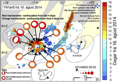 | 2775 Date: 2018-05-21 (Mon) アイスランドでも起きていた引き円錐型火山爆発 [2774]で紹介した“fried egg”(目玉焼き)型focal mechanisms というのは、定説である断層地震説では、どのような物理現象が起きているのか意味不明になってしまいます。キラウエアの地震でもAnomalous (異常)Earthquakes という表現になってしまいます。 断層地震説での断層周りの物理力に関しては間違いがあることを何度も解説してきました(たとえば[2584]など参照)。ここで再度気象庁のサイトに載っている断層の力学の矛盾を指摘します。 ![]() これが、気象庁のサイトにある地震発生のメカニズムです。 直交する二つの断層面を前提にする定説では ”目玉焼き方”つまり、一つ目小僧のような圧縮の場(P)・・・ というのは物理的な解釈が不能です 圧力(P)とか張力(T)という発想が間違っています。 圧力(押す力P)と表示してあるのはImplosionによる吸引力のことで、 張力(引く力T)と表示してあるのはExplosionによる爆発力のことです。 地震学者も、文科省も、気象庁も、「押しと引き」を正しく理解していません。 本当の「押し引き」とは、 つまり、地表での押し(上向き加速度)はExplosionによるもので、 引き(下向き加速度)はImplosionに起因しています。 断層地震説の力学は石本巳四雄先生の「押し円錐」または、「引き円錐」の力学を無視した、意味のない圧縮力P、引張り力Tを用いて説明しています。詳細は[2584]、[2586]などを見てください。 石本巳四雄先生が提案した「押し円錐理論」と、[2774]に示した押し引きが逆になる「引き円錐理論」で考えれば、物理現象との関連も付くのでCMT解も役には立つのです。 ![]() 石本巳四雄博士が提案した「押し円錐理論」 ![]() ![]() ![]() アイスランドのバルダルブンガ山で起きた引き円錐型地震爆発ではカルデラの崩落が発生した 通常の地震はもっと深い場所で発生しますから、重い天井を吹きとばしたり、落下させることはできません。よって、押し円錐や引き円錐の中心軸に沿った地盤の変動は大きくはなりませんが、大気に接している熔岩プールや、プールが浅い場所にあって、太い火道が通じているようならば話は別で、カルデラが崩壊することにも繋がります。 フンボルトは現在使われている深発地震(震源が200kmより深い地震)という概念とは別に、火山噴火にならない程度の深さの爆発地震を当時は深発地震と呼んで、噴火と地震を同じ現象として把握していました。