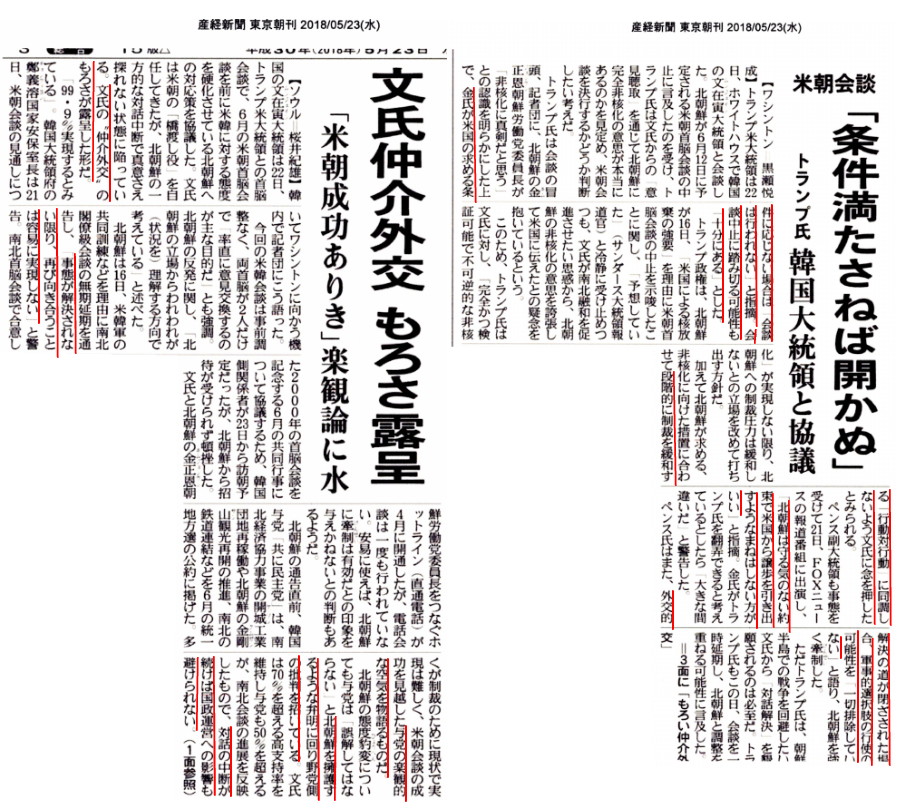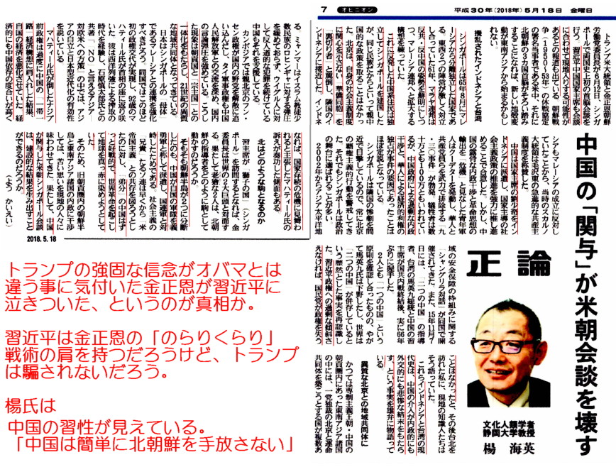 | 2779 Date: 2018-05-24 (Thu) 面子を捨てて中国に泣きついた金正恩・米朝会談は破談か トランプ大統領が文在寅との会談の後の記者会見で「金正恩が習近平に面会してから、急に姿勢を変えたのが不満だ」と語っています。 日本経済新聞 真相は、「金正恩が文在寅を手玉にとって、「時間稼ぎ工作」を図ろうとしたけど、トランプ氏の強硬な姿勢を知って、びっくりし、面子を捨てて中国に泣きついた」ということでしょう。中国が絡めば楊氏が言うように米朝会談は破談になるでしょう。5月18日の記事を紹介します。