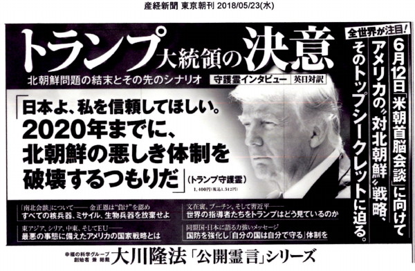 | 2777 Date: 2018-05-23 (Wed) 神代の時代と同じ事が起きている現代 古事記において造化の三神と呼ばれている方々のことが「黄金の法」には以下のように書いてあります。昔は霊的能力の高い人が政治を動かしていたようです。 ーーーーーーーーーーーーーーーーーーーーーーーーーーーーーーーーーーーーーーーーーーー 天御中主命は、巨大な霊能者でもあり、とくに、ひとたび彼が口を開いて発した言葉は、必ず成就することで有名でした。ですから、だれもが、その神秘力に打たれたのです。たとえば、御中主が、隣国が何月何日に和睦を申し入れてくると予言すると、必ずそのとおりになる。あるいは、三月以内に、巨大な城を築いてみせると言うと、どこからともなく資材が運ばれてきて、協力する人々が集まり、そのとおりに完成する。すべてが、こういう具合でした。 二代目は、御中主の臣下のなかで、もっとも霊能力に優れ、徳の高かった高御産巣日命に位がゆずられたのです。この高御産巣日命は、霊視が非常によく利いた方で、いわゆる千里眼でした。そのため、敵国の様子が、居ながらにして百パーセント分かってしまうため、戦において敗れたことがありませんでした。 そして、次に出て来た三代目の国王が、神産巣日神です。この方も、霊言能力に優れており、すでに、ひと足早く霊天上界に還った天御中主命から直接通信を受けて、国政の指針としておりました。ここに挙げた三人とも、八次元如来界の方であり、日本神道の格を高めた方です。 ーーーーーーーーーーーーーーーーーーーーーーーーーーーーーーーーーーーーーーーーーーー この世を生きる科学者が霊能力などを話題にすることは「生活を危うくする」危険性もありますが、私のような年金生活者ならその心配もなく、安心して話せます。 ところで、現代にもこのような霊能力者が存在し、「守護霊インタビュー」として世界の政治家の本心を読むことが出来るのですから驚きです。 一連の霊言集のなかで、前にも紹介してきた「トランプ大統領の決意」([2753]参照)が発刊され届きました。新聞にも広告が載っていました。 ![]() ![]() 収録日(4月28日)の時点で、歴史的な平和会談視論は甘い予想であることがはっきりしている。 きょうの新聞には、こうした本音を証明するかのような動きが報じられています。