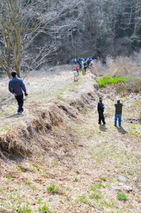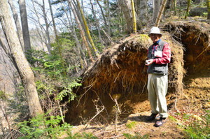 | 2787 Date: 2018-06-01 (Fri) 地震時の「跳び石現象」は爆発が起きたことを意味している 地殻の中に、壁のような貫入岩が形成されるのには、高圧の環境または衝撃的な爆発力が必要になります。地震時には「海震」とか「飛び石(跳び石)」という現象が観察されることがあります。([1248]、[1268]、[1423]など参照) この飛び石現象に関して、「絵でわかる地震の科学」という書籍(井出哲著講談社刊p.24)に、中国での例が載っていました。 ![]() 飛び石現象に気が付きながら、内容は「断層地震説」のままです。 飛び石(跳び石)現象は「石灯籠が水平的に飛んできて人命を奪った」とか、日本でもたくさん観測されています。一例ですが、強震動の基礎には、長野県西部地震(王滝村)で起きたものを調査した結果が載っています。 ![]() 長野県西部地震(王滝村)で調査した跳び石現象 本震の震央近くでは、ほとんどすべての石が跳んだ(黒塗り部分)とある。 [1423]断層地震説では説明できない巨大な跳び石に紹介した四川大地震の巨石の写真もその一例だと思います。 また、岩手宮城内陸地震([1429]4000ガルを超える爆発現象)で記録された4000ガルを超えるような加速度は「地震は爆発である」ことを証明しているのですが、地震学者は「断層地震説」にしがみついています。 調べていて見つけたのですが、2011年の東北大震災で副次的に起きた「いわき市田人」の地震災害の「現場を見学する会」の報告記事があります。 ーーーーーーーーーーーーーーーーーーーーーーーーーーーーーーーーーーーーーーーーーーーーーーーー 想定外 正断層のずれ 「浜通り地震」の見学会 ![]() 1メートル以上の段差がある塩ノ平断層が延々と続く=いずれも福島県いわき市田人で この地震は、いわき市田人(たびと)の地下六キロを震源にしたマグニチュード(M)7・0の大地震だった。田人地区では約十四キロにわたって断層が現れ、ずれは最大二・一メートルにもなった。研究者を驚かせたのは、それが近年の日本では初めて出現した正断層だったことだ。しかも、東北地方太平洋沖地震に誘発されて起きた。 講演会の講師は、地震の直後から現地で調査を続けている産業技術総合研究所(産総研)の活断層評価研究グループリーダー、宮下由香里さん。 地震を起こした断層は、塩ノ平(ひら)断層と湯ノ岳断層という二つの断層だった。「活断層とは分かっていたが、主要活断層帯のリストには入っていない断層だった」と宮下さんは説明した。リストとは、国の地震調査研究推進本部がM7クラスの地震を起こす可能性があるとして選んだ百十の断層のことだ。 今回の地震では、わずか数秒の違いで塩ノ平断層、湯ノ岳断層と二つの断層が活動。塩ノ平断層は北北西−南南東方向、湯ノ岳断層は北西−南東方向で、いずれも西側が滑り落ちている。 宮下さんの調査から、湯ノ岳断層は千〜六千年前の間に一度、活動していたことが分かった。塩ノ平断層は、別の調査で前回は一万二千年より前だった。二つの断層の活動間隔は違うようだ。 講演会後、地震発生の仕組みに詳しい産総研の今西和俊・地震テクトニクス研究グループ長に「なぜ、震災前には分からなかったのか」と聞いた。 「日本列島は東西から圧縮されているので、正断層の地震が起きるとは考えられていなかった。調べてみると、東北地方太平洋沖地震の前から、福島県から茨城県にかけては局所的に圧縮場ではなく、正断層の小さな地震が起きていた。地震が小さく、数も少ないので、震災前は気付かなかった」と今西さんは言う。 湯ノ岳断層は福島第一原発から五十キロ、福島第二原発からは四十キロにある。東京電力は震災前、耐震設計上、考慮する活断層とは評価していなかったが、地震の後「考慮すべきであった」という調査結果を公表している。 (福島駐在編集委員) ![]() 尾根筋で見られる塩ノ平断層。尾根道が突然、行き止まりになっている。 今回の講演会と見学会は、震災遺産保全プロジェクトの一つとして、福島県立博物館が主催した。いわき市民を中心に約五十人が集まった。見学会はマイクロバス二台に分乗して、同市田人地区で塩ノ平断層を見学した。 断層の名前にもなった塩ノ平地区。バスを降りると、断層の記念植樹が目に飛び込んできた。荒れ地を歩くと小さな池があり、その先に谷川が流れている。 「断層が川を横切り、上流側が下がったので、水の流れがせき止められて池ができました」と宮下由香里さん。「断層池」と呼ばれる、珍しい地形だ。 次は近くの民家の庭にバスを止めさせてもらい、里山に登る。尾根を少し歩くと、人の背の高さほどの段差が見えた。断層は崩れずに残っていた。宮下さんがネジリ鎌で表面についた土を削った。土の中にあった、握りこぶしほどの石が鋭利な刃物で切られたようになっていた。断層のすごさを感じた。 「(名物の)たびとまんじゅうを売れば、町おこしになる」「除染なんかやるより、ここを(震災遺構として)残したい」。迫力