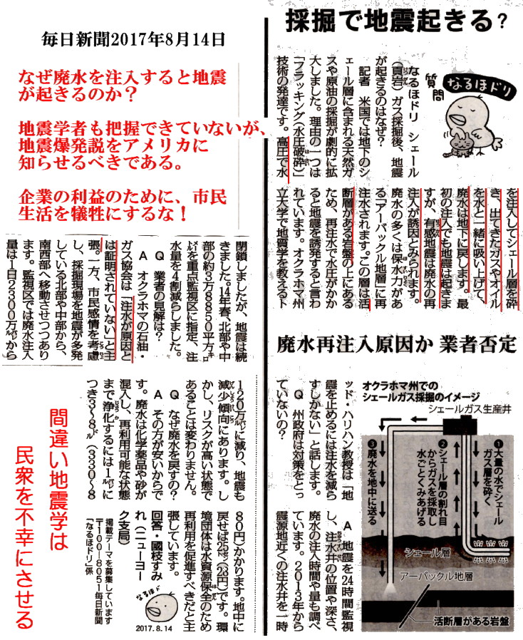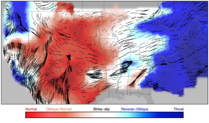 としてありますが、「地震を起すエネルギーをため込む」というのは力学的に間違っています。岩盤は長期的に見れば粘弾性体ですから、エネルギーを溜めることはありません。地震エネルギーを地盤がため込むことはありえません。ステレオタイプの非論理的な報道です。 今回はどの活断層が動いたのか、特定できなかったですし、明確な断層も現れていません。「断層が動くことが地震」という“原理・原則”のような似非科学理論に束縛されています。熊本の例を引いて出している警戒コメントも日本人なら誰でも言えるような内容です。 「プレート教原理主義は」はアメリカでも蔓延しています。 オクラホマでのシェールガス採掘で地震が多発していますが、素直に考えて今まで地震が起こっていない地域に突然地震が起きたのですから、原因はシェールガスの採掘にあるはずです。アメリカでは一部の地震学者も認めている筈です。 しかし全体的には「原理主義」に束縛されています。 ![]() Sketch of plate boundary stress applied to the North American plate. ![]() ![]() The new U.S. stress map. The colors show the style of faulting - red is normal faulting, white is strike-slip, and blue is thrust. The black lines show the direction of the stress. 現在の地震学は無明に支配されています Both Japan and the US should restart from the Humboldt seismic outlook Current seismology is dominated by ignorance |