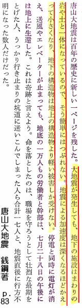 | 2817 Date: 2018-06-22 (Fri) 震源断層というのは「まやかしの概念」、あるわけがない [2812]で紹介した地震調査委員会のコメントでは、 「今回のようにマグニチュード(M)6程度の規模では、断層が地表に明瞭に露出するとは考えにくい。」 としていますが、「震源付近に断層があるが、地表までは顔をださなかった」というのはまやかしの概念です。誰も確認できないから、“上手な嘘”ではありますが・・・。 小さな地震では「断層」ができないのです。 “地表よりも震源に近いほうが動きが激しいだろう”というのが直感でしょうが、それは地上での爆発の概念です。周囲の支え(支持物体)がある地下では、加速度は抑えられるのです。 振動被害が大きくなるのは地表(自由端)であって、炭鉱のような深い場所では振動は大きくならないことは鉱山関係者はよく知っています。 「今世紀(20世紀)最大の震災」といわれた中国の唐山大地震でも、炭鉱内にいた一万人の鉱夫達は「一部」を除いて皆無事だったことが報告されています。 ![]() 地表では壊滅的な被害を受けた唐山地震、死者は24万人とも、それ以上とも言われている。 しかし地下の炭鉱の鉱夫達は(一部を除き)無事だった。