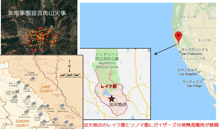 | 2821 Date: 2018-06-27 (Wed) カリフォルニアの山火事で非常事態宣言、火事の原因を知るべし カリフォルニア州の山火事がコントロール不能になっていて、非常事態宣言が出されたそうです。1960年にカイザーズの地熱発電が開始されましたが、それ以降年々消失面積が増加しています。「地球の記録」から抜粋して紹介します。 ーーーーーーーーーーーーーーーーーーーーーーーーーーーーーーーーーーーーーーーーーーーー 米カリフォルニア州で複数での出火状況によりコントロール不能となった山火事に非常事態が宣言 投稿日:2018年6月27日 世界中で森林火災による被害は拡大する一方ですが、その本格的なシーズンは夏ですので、また世界各地で山火事などの報道が増えていく時期となりました。 そんな中で、6月26日、アメリカのカリフォルニア州のブラウン知事は、前日、カリフォルニア州で発生した森林火災が、「コントロール不能になった」とし、非常事態を宣言しました。 このレイク郡での火災がどれだけ「コントロール不能となっているか」を示すものに「新たな出火状況」のファイヤーマップがあります。 日本時間で 6月25日の時点で、レイク郡では下のように「新たな出火」が広がっています。赤いドットが新たな出火地点で、オレンジは延焼地域です。
