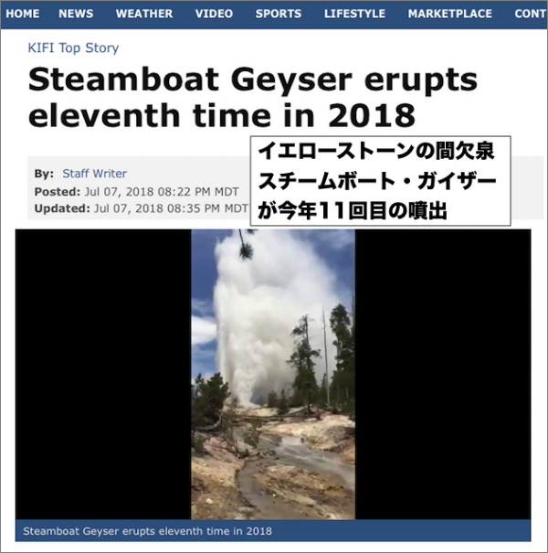 | 2830 Date: 2018-07-11 (Wed) 1961年まで、 50年間噴出しなかった「スチームボート・ガイザー」が今年は11回も噴出 イエローストーン公園の間欠泉が異常な活動をしていることは、これまでも地球の記録に報告されてきましたが、今年11回目の噴出があったそうです。 1961年までの50年間は活動が無かったこと、1961年からも年一度または活動(噴出)なしが続いたのに、今年11回も活動(噴出)し、科学者たちはその原因が分からないと述べています。 ーーーーーーーーーーーーーーーーーーーーーーーーーーーーーーーーーーーーーーーーーーーーーーーー イエローストーンの間欠泉スチームボート・ガイザーがついに今年11回目の噴出を記録。過去のすべての記録を大きく上回る活動状態に 投稿日:2018年7月10日 7月7日の米国のローカルニュースより