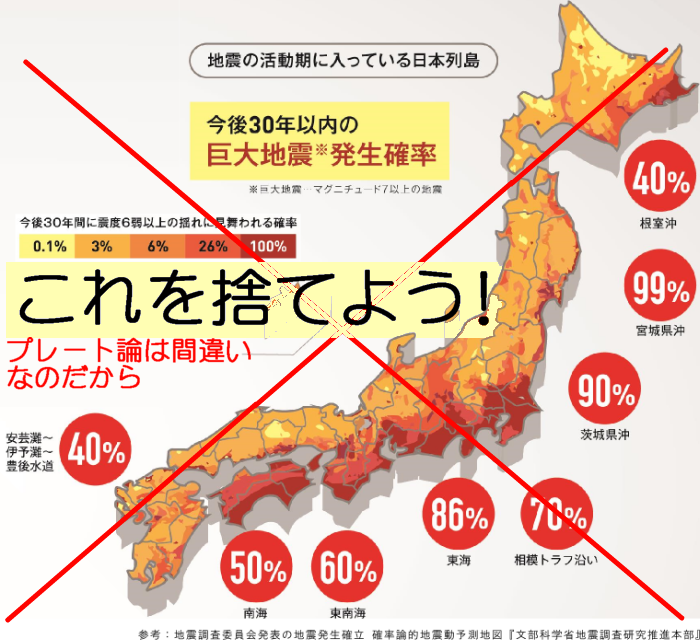 | 2823 Date: 2018-06-30 (Sat) 地震予知が成功せず、地震発生確率が当てにならない本当の理由 地震予知が成功せず、発生確率が当てにならない本当の理由は地震理論が間違っているからです。 大阪北部の地震は熊本地震と同じ、地震の発生確率がとても低い地域でした。 地震予知は又しても失敗しました。 予知が出来ない理由も確立が当てにならない理由も、地震発生の仕組みを間違えているからです。 確率表は「プレートが潜り込んで歪が溜っているに違いない」という発想に基づいて作られています。周期性というのもプレート論を信じなければ出てこない発想です。 週刊朝日の報道を紹介します。 ーーーーーーーーーーーーーーーーーーーーーーーーーーーーーーーーーーーーーーーーーーーーーーー やはり南海トラフ地震の前触れ? 日本の地震予測が当たらないワケ〈週刊朝日〉 死者5人、負傷者400人以上の被害をもたらした最大震度6弱の大阪北部地震。これは果たして南海トラフ巨大地震の前兆なのか。検証した。 政府の地震調査委員会は今回の地震を「有馬─高槻断層帯」など三つの活断層に関連している可能性があると発表した。しかし、これらの断層帯のどこかで30年以内に地震が発生する確率は0%から3%。振り返れば、震度7を2度記録した2016年の熊本地震でも30年以内のマグニチュード(M)7.0級の地震発生確率は1%未満だった。地震予測はなぜこうも当たらないのか? 地震調査委員会では今回の大阪北部地震を「有馬─高槻断層帯」「生駒断層帯」「上町断層帯」のいずれかが動いたものと捉えている。 しかし、この三つの断層帯で今後30年以内に大きな地震が発生する確率はそれぞれ0〜0.03%、0〜0.2%、2〜3%と低かった。 そもそも大阪府周辺の主要活断層帯で今後30年以内に大きな地震が起きる確率は、政府の地震本部によると0コンマ台が大半を占める。いわば近畿での内陸型地震はノーマークの状態だったのだ。国の地震調査研究費は16年度が112億円、17年度は63億円に上る。カネをかけている割にはさっぱり当たらない地震予測に対し、地震学者からも疑問の声が出ている。 『日本人は知らない「地震予知」の正体』の著書があるロバート・ゲラー氏(東大名誉教授、地震学)は、政府の予測を「問題だらけ」と指摘する。 「地震が起きるメカニズムは非常に複雑で、現在の科学で予知ができないのは地震学の世界的なコンセンサス。それなのに検証されていない計算式を使い、今後30年間で70%程度の確率で地震が起きるなどというハザードマップを作っている。これはもはや予言の類です」 ゲラー氏によると、政府のハザードマップは(1)地殻にひずみがどれだけたまっているか、(2)地震が周期的に起きているかどうか、の二つの仮説に基づいて作られている。しかし、地震発生が周期的でないことは、米国カリフォルニア大学ロサンゼルス校の研究者たちによってすでに明らかにされているという。 「政府は南海・東南海、東海、首都圏などで今後30年以内に震度6弱以上の地震が発生する確率が高いとしていますが、実際に震災が起きているのは比較的安全とされた地域ばかり。予測など信じず、大地震はどこでも不意打ちに起きると考えることが肝心です」 気になるのは大阪北部地震と南海トラフ地震との関連だ。地震学者の都司嘉宣氏は「南海トラフ地震の発生はおよそ100年周期。前回からすでに72年が経ち、プレート間のひずみがかなりたまっている」という。 また島村英紀氏(地震学)は、南海トラフ地震が起きる20〜30年ほど前から西日本で内陸型地震が多くなる事例が過去にあったと警鐘を鳴らす。 「前回の南海トラフ地震(1946年)が起きる前にも北但馬地震(25年)、北丹後地震(27年)、鳥取地震(43年)といった内陸直下型地震が続けて起きた。5年前に兵庫県淡路島付近でM6.3、3年前には徳島でM5.1の地震が発生していますが、今回の大阪北部地震を含めて南海地震の前触れだとも考えられます」 いつでも起こり得る大震災への備えが必要だ。(桐島 瞬) ーーーーーーーーーーーーーーーーーーーーーーーーーーーーーーーーーーーーーーーーーーーーーーー 記事の中でゲラー氏が言っている内容は一理ありますが、地震発生の正しいメカニズムを把握した上での発想ではありません。 (1)歪の蓄積 というのはプレートテクトニクス理論に立脚しています。 プレート論を信じているから、歪が一定速度で蓄積されている、従って周期的に巨大地震は起きる、という結論になります。 しかし、何度も提起しているように、プレートテクトニクスは間違っています。 プレートが潜り込んでいるというのも間違いです。したがって、歪が一定の速度で蓄積されることもありません。歪が開放されることが地震ではありません。歪は「粘弾性体」には蓄積されません。 「プレートが潜り込み、歪が溜って地震が起きる」という理屈から計算される地震発生確率がまったく当てにならないのは、この「間違い地震論」をベースにしてい