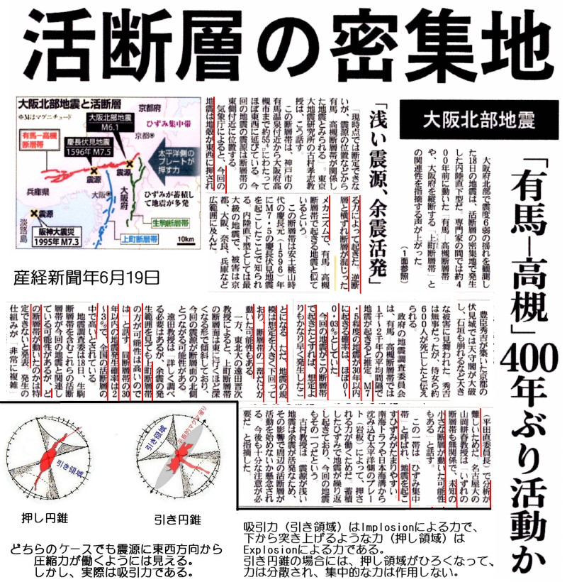 ーーーーーーーーーーーーーーーーーーーーーーーーーーーーーーーーーーーーーーーーーーーーーーーーー 震源断層は特定できず 複雑な発生メカニズム 地震調査委が評価公表 大阪府北部で震度6弱の揺れを観測した地震の発生を受け政府の地震調査委員会は18日、臨時会合を開き今回の地震に関する評価をまとめ公表した。地震を起こした震源断層は特定できず、周辺の活断層帯と「関連した活動である可能性がある」との表現にとどまった。 会見した平田直委員長は「(発生メカニズムが)非常に複雑で、どの断層に関連しているかを言うのは難しい」と述べた。 今回の震源周辺は地震を起こすひずみがたまりやすい「ひずみ集中帯」に含まれ、近くには東西に延びる有馬−高槻断層帯のほか、上町、生駒の各断層帯が南北に延びている。 このうち上町断層帯は震源から西に少し離れているが、地下の断層面は東側に向かって傾斜しており、震源周辺まで延びている可能性があると判断した。 調査委は、今回の地震がいずれかの活断層帯に関係することは否定できないとしたが、どれか1つを特定するのは困難だという。今回のようにマグニチュード(M)6程度の規模では、断層が地表に明瞭に露出するとは考えにくい。 調査委が地震のメカニズムを複数の手法で調べたところ、一致しなかった。余震のタイプも活動域の北側は逆断層型、南側は横ずれ断層型で異なっている。平田委員長は「地下にある震源断層のずれ動いた面が、途中で折れ曲がっている可能性がある」と推測する。 臨時会合は当初予定より1時間ほど延びて3時間近くに及んだ。平田委員長は「候補となる活断層が多くて時間がかかった。注意深く議論した」と話した。 ーーーーーーーーーーーーーーーーーーーーーーーーーーーーーーーーーーーーーーーーーーーーーーー 新聞の欄外に載せておいたように、この地震は「押し円錐」と「引き円錐」の両ケースが考えられます。あるいは、震源(爆発点)を挟んで「押し」と「引き」が混在しているのかもしれません。さらに多くの観測データから、CMT解の精度を高めないと判定できないように思います。 断層が見つからないというのは、引き円錐型なのかもしれません。引き円錐の場合には、Explosionによる「押し」領域が広がって集中的な力が働かないからです。 地震学者の意見がバラバラですが、どれもピントがずれています。 関連記事 尾池教授は何を言っているのでしょうか、支離滅裂なことを言っています。“歪エネルギー積立貯金説”など力学音痴を曝け出しています。 宮根氏は地震学者の力学音痴を見抜け! |