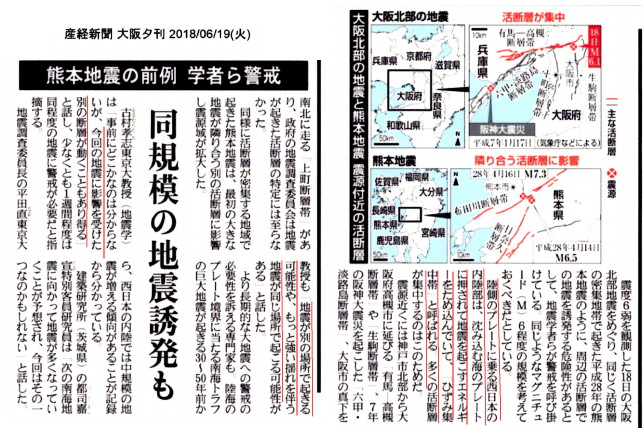 | 2814 Date: 2018-06-20 (Wed) 日米ともにフンボルトの地震観に戻るべし 政治向きの記事では信頼している産経新聞の編集陣でも、地震学に関しては、地震学者の意見を垂れ流すだけです。 [2812]の紙面でも「太平洋側のプレートが押す力」が地震の原因であるような書き方でした。 昨日の夕刊にある記事も、熊本地震の前例を挙げて「同規模の地震誘発」もある、と地震学者の警戒を報じています。