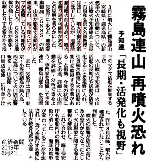 | 2815 Date: 2018-06-21 (Thu) 噴火は低下したが地震は増えた、なぜだろうか? 今日の産経新聞に「霧島連山 再噴火の恐れ」という記事がありました。火山噴火予知連絡会は「噴火活動は次第に低下しているが、地震活動は噴火前より高く、噴火を繰り返す可能性がある」との見解を明らかにした、とあります。 ![]() 「世界中で増えてる自然現象だよ、地球が噴火したいのだろうさ」で済ませてしまっていいものでしょうか。「地熱発電所(大霧地熱発電所)で地下内部のバランスを人為的に乱すことは危険である」と警告している声があるのに、「そんな馬鹿な話は学者が相手にしないよ」というような姿勢が続いています。 グアテマラのフエゴ山も、シナブン山も近くで地熱発電による熱水の汲み上げをやっています。事態を真剣に受け止め、噴火や地震の真相を考えないと「思考停止」のままでは皮膚癌で済んだところを骨の癌にまで放置してしまった、という事になりかねません。 関連記事