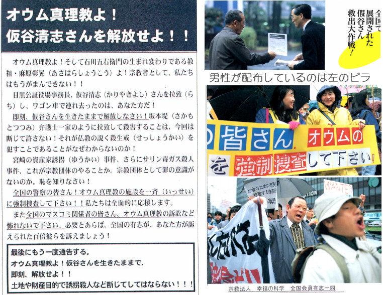 当時オームの反社会性をウォッチしていた幸福の科学の会員有志が仮谷氏の拉致事件を目撃し、警察の捜査が始まる前から、立ち上がって運動を展開しました。 1995年(平成7年)2月28日午後4時半ごろ、東京都品川区上大崎の路上で、目黒公証役場から出てきたこの職員を信徒らがワゴン車に連れ込んで拉致、山梨県西八代郡上九一色村(現:南都留郡富士河口湖町)のサティアンに連れ込んだ。 教団は、麻酔薬のチオペンタールを投与することで、被害者の妹の居所を自白させようとしたが果たせなかった。そこで麻原彰晃は、拉致実行犯の一人に被害者を絞殺させることとし、「(被害者を)ポアさせることによって(実行者)に徳を積ませる」と称し、東京からサティアンに呼び戻すことになった。その間、被害者は麻酔薬を過剰に投与されたため、3月1日午前中に死亡した。午後になって麻原指名の実行者が到着し、既に死亡したことを知らせずに被害者の首を絞めさせた。遺体は中川智正ら数名がマイクロウェーブを応用した焼却炉で焼却し、骨や灰は細かく砕いて本栖湖に流して死体遺棄をし、証拠を隠滅した。麻原は中川らに報酬として、おはぎとオレンジジュースを渡した。 写真にあるのは全国のオウムの施設を強制捜査せよというデモ行進の様子です。 NHKは勿論マスコミはこの「仮谷さん大救出作戦」や「オウム施設強制捜査請求デモ行進」を一切報道しませんでした。 ![]() 「オウム真理教撲滅作戦!」(幸福の科学広報局編)より 宗教的な知性の欠落です。 Ohm 's antisocial behavior was not able to be seen, It is a lack of religious intelligence. このセミナーで展開している地震の原因説に関しても「報道しない自由」を未だに行使しています。思考が停止しているのでしょう。 参考: |