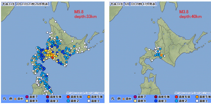 | 3066 Date: 2019-04-03 (Wed) 苫小牧第3地震は小さかったが、完全終了時には大きな地震が起こるだろう 本日午前9時44分北海道胆振東部でM3.8(深さ40km)の地震がありました。2月21日のM5.8(深さ33km)地震と比較すると、震源はほぼ同じであることが分かります。