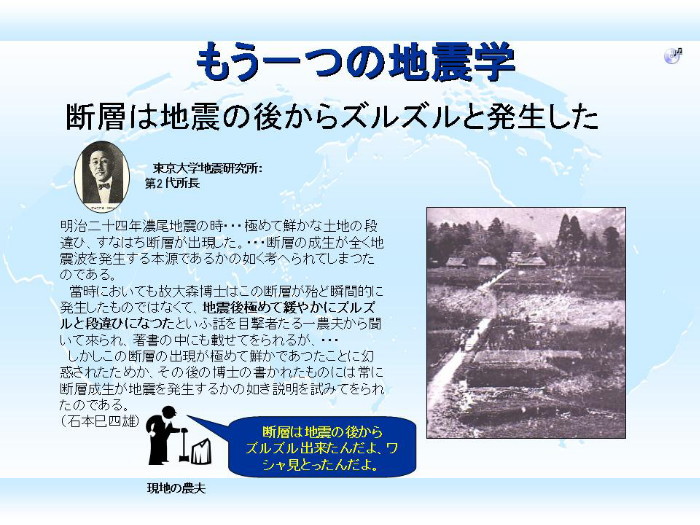 | 3069 Date: 2019-04-08 (Mon) アスペリティーの矛盾(再)と洗脳教育 地震現象を「マグマ爆発論」で考えていた高木聖博士なら、「アスペリティ(固着域)」という概念も「観念的な遊び」と即断されるに違いないと思います。このセミナーでは17年前にも[222]アスペリティーモデルの矛盾で紹介しています。 しかし、いまやどの教科書にも「アスペリティー」という用語が載っていて、初学者を洗脳しています。 ある著名な女性地震学者が執筆したページから紹介します。日本政府の地震本部のサイトに載っているものです。 ーーーーーーーーーーーーーーーーーーーーーーーーーーーーーーーーーーーーーーーーーーーーーー