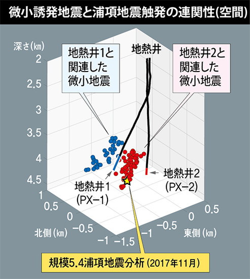 | 3065 Date: 2019-04-01 (Mon) 九州の九重山が活動的になっている原因について [3053]で紹介したように韓国では「浦項地熱発電所の未熟な操業方法によって誘発地震を発生させてしまった」ことを韓国政府が認め謝罪しています。 大量の水を一気に圧入し、汲み上げるという「地下圧力の急増・急減」を引き起こす無謀な操作をやっています。 日本の地熱発電所ではこのような操業方法は採用していないとは思いますが、3月28日の福岡管区気象台の火山情報が少し気にかかっています。解説情報1号を紹介します。 -------------------------------------------------------------------------- 火山名 九重山 火山の状況に関する解説情報(臨時) 第1号 **(見出し)** <噴火予報(噴火警戒レベル1、活火山であることに留意)が継続> 九重山では、28日07時頃から火山性地震が増加しています。 **(本 文)** 遠望カメラによる観測では、硫黄山の噴気の状況などに特段の変化は認められません。 本日、九重山の現地調査を実施予定です。 2.防災上の警戒事項等 <噴火予報(噴火警戒レベル1、活火山であることに留意)が継続> ------------------------------------------------------------------------- 九重山で火山性地震が増加していて、「噴火警戒レベル1」が継続しているという発表です。 じつは[2360]〜[2365]で紹介しましたが、九重山の近くには日本最大の地熱発電量を誇る「八丁原地熱発電所(九州電力)」、「大岳発電所」、「九重発電所」などが稼動しています。