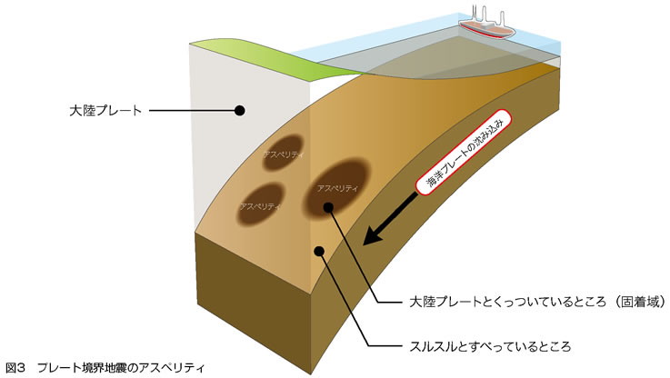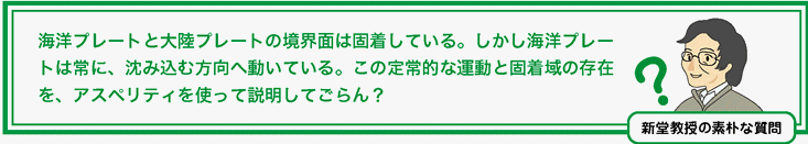 先生:正解だ。地震を過去にさかのぼって調べることで、同じアスペリティが繰り返し地震を起こしていることや、それぞれのアスペリティの大きさもだいたい決まっていることがわかってきた。プレート境界地震については、地震を起こす場所についても、面積についても、だいぶ理解が進んできたのだよ。