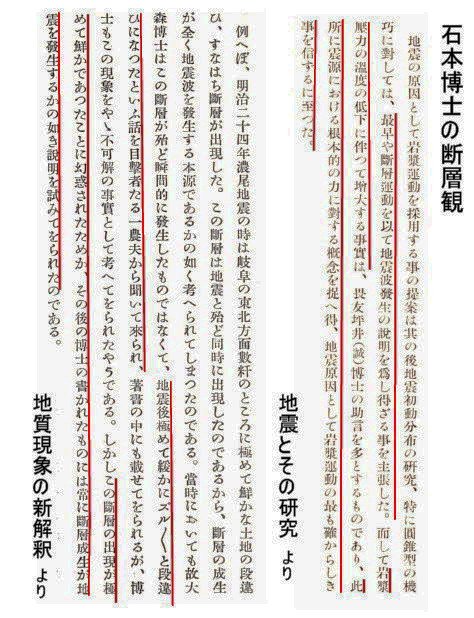 | 3054 Date: 2019-03-22 (Fri) 地震は断層運動という常識はすでに崩壊している 石本巳四雄博士が「地震の原因を断層運動ではない」と考えておられたのは、何らかの原因で「マグマの爆発的な貫入」が起きているからだと見ていたからですが、博士の記述した記事からそれを見てみます。 ![]() 当時は解離水という理解はありませんでしたが、解離反応は吸熱反応ですから、マグマの温度低下によって、マグマの圧力が高まるという視点(畏友坪井(誠)博士の助言)は現代の地震爆発論へと繋がる知見であります。 そして、「地震原因として、岩漿(マグマ)運動の最も確からしき事を信ずるに至った」とあります。 地質現象の新解釈は小川博士の著書ですが、その中に石本博士の見解が収録してあります。 とあります。断層が動くことが地震なら、ズルズルと緩慢な動きで断層が出来ることはありえないはずです。 ![]() この件は中国の四川省地震でも見られました。地震後に生徒たちが広場に集合してから、断層がコンクリートの破壊音を伴って出現したと報告されています。 ![]() 中国四川大地震より だから何も説明できないのだ! |