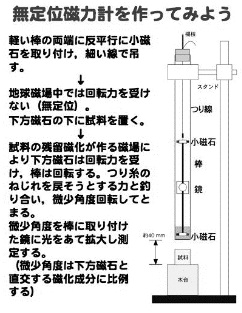 | 3115 Date: 2019-06-15 (Sat) 高木式無定位磁力計による地震前兆観測について IEEEの原稿作り作業の中で高木聖博士の「無定位磁力計による地震前兆現象について」という論文の存在を知りました。1960年2月10日受理となっていますから、「国会における地震予知の審議」(1959年12月2日)の後に執筆されたものです。 国会に提出された高木式磁力計の図面が分からないと[1188]、[1191]には書いてありますが、その図は以下(左図)のようなものでした。右図は京都大学実験室紹介にあった無定位磁力計です。 ![]()