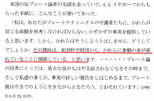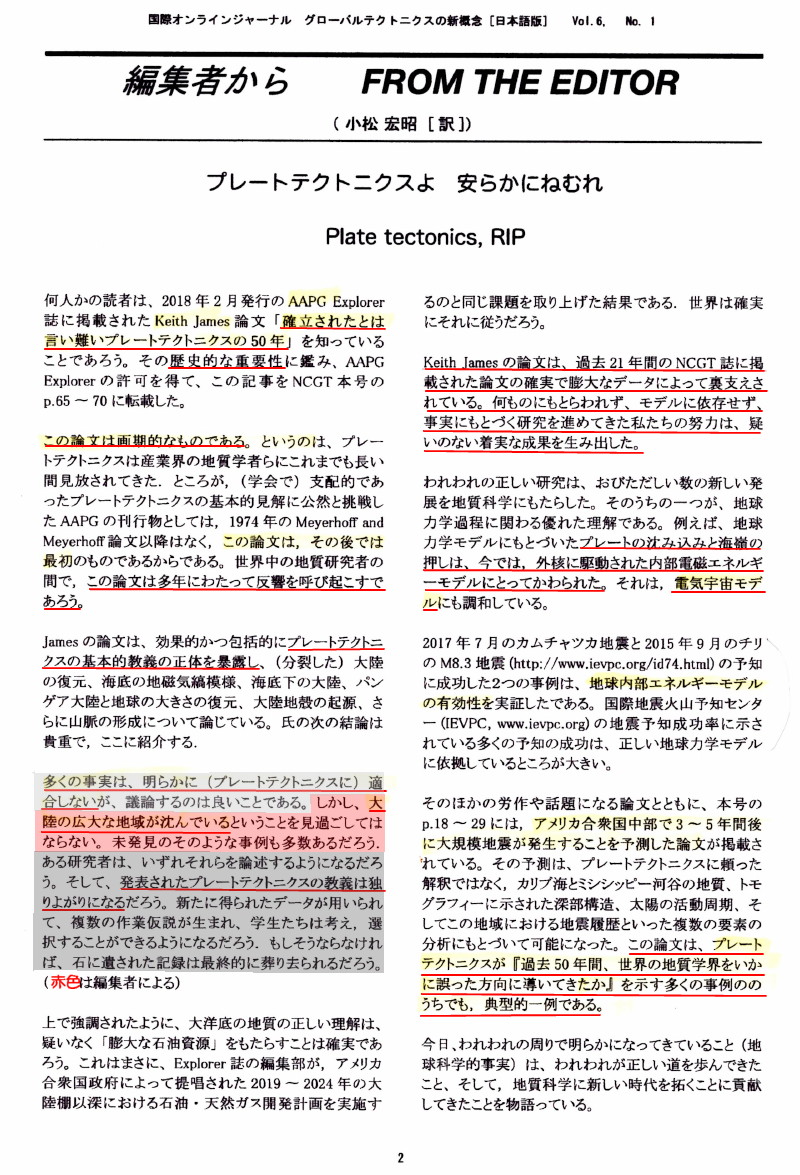 | 3124 Date: 2019-07-17 (Wed) プレートテクトニクス神話の崩壊が始まった NCGT(グローバルテクトニクスの新概念)の記事は最初の頃は「反プレート論」的なものが多くて、参考にしていましたが、([1384]〜[1386]など)、最近は「反プレート論」以外のものも多くなり、あまり見ていませんでした。 8月31のシンポに向けて準備する中でNCGTの編集者CHOI氏が昨年お亡くなりになり、編集長が代わったことも知りました。 ![]() 日本は先進国の中で、プレート論をRIP扱いするのに○○年遅れた、と言われないようにしたいものです。 そうではなく、むしろ、小川・石本・高木らの研究を誇りに思うべきです。 [1386]にも紹介しましたが、世界中の海洋底に古期岩石や大陸性岩石が存在しているのですから、プレート論が破綻していることは明らかです。石油産業などの技術者はプレート論などに興味は持っていないようで、現実を見て仕事をしているようです。 NCGT誌が「反プレート論」を推進してきた力は大きいと思いますが、「内部電磁エネルギー」とか「電気宇宙モデル」という概念は「地震爆発論」とは調和的ではなく、支持はしていません。 PT論の受容が遅れたのは日本の研究陣が賢明だったのだろうと書いてきましたが、逆に「日本は新しい概念を受け入れることが苦手」な民族で構成されているのかもしれません。 参考: 「反プレートテクトニクス論」の中で星野先生はA.Aマイヤーホフからの手紙を紹介しています。研究ファンドの枯渇を心配する声は[1834]、[1835]などでも紹介しましたが、研究生活がお金で拘束されるのは悲しいことです。 ![]() 星野通平著「反プレートニクス論」p.177より |