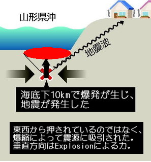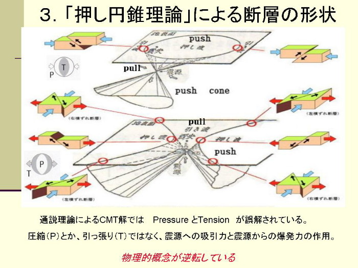 これがプレート論の説明ですが、自重で沈んでいく岩盤がどうして巨大な地震が起こせるだけの圧力をユーラシアプレートに働きかけることが出来るのでしょうか。「溺れるものは藁をも掴む」ものですが、プレートを押せるのなら、プレートを掴むことだって出来るでしょう。沈み込む板にそんな芸当は出来ません。プレートの沈み込みは起きていません。 A『ひずみ集中帯』という概念が出てきています。岩盤に楔を打って行う「石割り作業」を見れば分かるように、ひずみが限界に来たら、ハンマーで最後の一撃で「ピシッ」という音とともに割れます。『ひずみ集中帯』とは、「ひずみが集中してもう直ぐに割れる寸前の地帯」という意味になるのではないでしょうか。その場のひずみが開放して、どうして地震など起きるのでしょうか。まったくの「妄想地震説」というものです。 B「未知の活断層が動いた」とも「活断層が動いた証拠はない」ともあります。震源が深いので活断層ではなく震源断層が動いたといいたいのでしょうか。 読み終わった読者には、結局何がなんだか分からない記事でしかありません。 地震の真相は爆発です。震源で上向きのEXPLOSION(爆発)が発生し、水平方向には震源に向かって爆縮(IMPLOSION)が起きたために吸引されるのが真相です。 [3116]に図示したように、上向きに形成される「押し円錐」内の「押し領域」とそれ以外の周囲にできる「引き領域」の境界にできる亀裂が「断層」というものですが、大きな爆発でなければ断層は出来ません。 地震現象とは解離ガス(水素と酸素の混合体)の爆発です。 |