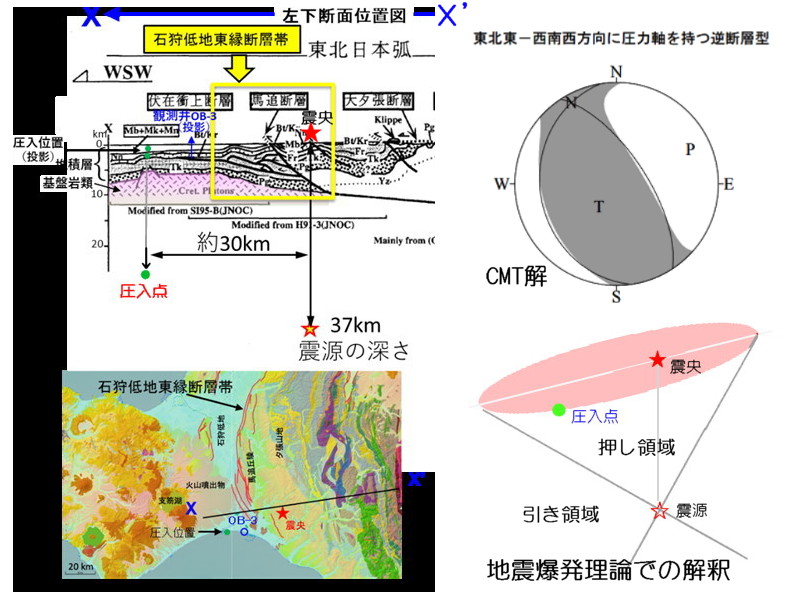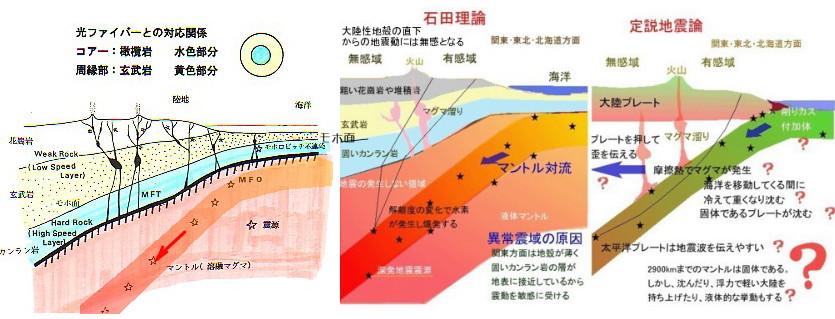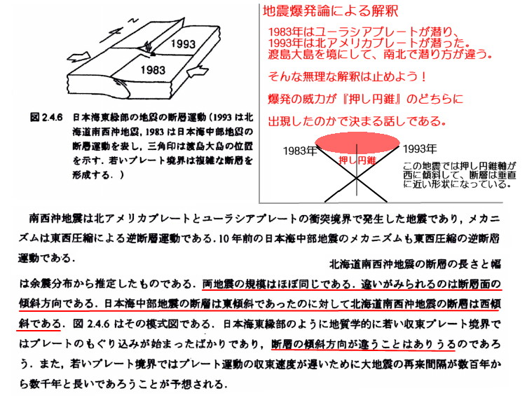 | 3118 Date: 2019-06-25 (Tue) 日本海東縁ひずみ集中帯という妄想 雑誌AERAの記事にも、西村(准教授)と遠田教授の解説が載っています。抜粋して紹介しますが、こんな地震学では何年研究をやっても、地震の真相は解明されません。成果は出ないでしょう。 ーーーーーーーーーーーーーーーーーーーーーーーーーーーーーーーーーーーーーーーーーーーーーーー 新潟・山形地震の震源一帯、過去にM7級4度も…恐るべきその正体〈AERA〉 新潟と山形を襲った地震の震源地一帯は、過去にも大地震が繰り返し起きてきた“ひずみ”が集中している場所だった。専門家が解説する。 * * * 6月18日夜に新潟や山形を襲ったマグニチュード(M)6.7の地震。新潟県村上市で震度6強を観測したほか、山形県鶴岡市で震度6弱、秋田県由利本荘市や山形県酒田市、新潟県長岡市、柏崎市などで震度5弱を観測した。震源は山形県沖で、これまでに知られている活断層とは一致せず、未知の断層だったとみられている。 未知の断層が原因とは言え、今回の震源地を含む一帯ではこれまでも、大きな地震が繰り返し起きてきた。 京都大学防災研究所の西村卓也准教授(測地学)によると、震源を含む一帯は「日本海東縁ひずみ集中帯」と呼ばれる。 日本海東縁ひずみ集中帯は、北海道沖から新潟県佐渡島沖にかけての東西100キロほどの帯で、東日本の「北米プレート」と西日本の「ユーラシアプレート」の境界付近に位置している。この場所にひずみが集中していることについて、西村准教授は「学説としては比較的新しく、40年くらい前から提唱されている」と話す。 柏崎刈羽原発の火災も起こした新潟県中越沖地震(M6.8)や104人の死者を出した1983年の日本海中部地震(M7.7)、津波が発生して26人が死亡した64年の新潟地震(M7.5)、1833年の庄内沖地震(M7.7)も、このひずみ集中帯で起きている。 東北大学の遠田晋次教授(地震地質学)は、ひずみについてこう解説する。 「地質学的に言えば、地殻が東西方向に押されて短くなってしまう現象です。非常に長い時間スケールで、過去の地震などを原因に、地殻が何百メートルも何キロも縮んでいることを確認しています」 この日本海東縁ひずみ集中帯の南側にある「新潟─神戸ひずみ集中帯」も大きな地震に警戒が必要だ。 (編集部・小田健司) ![]() ![]() 日本海東縁ひずみ集中帯................石割作業:楔を打ったラインはひずみが集中しています。 石割り作業では最後のハンマー一振りで”ピシッ”という音を出して割れてしまいます。震動も轟音も発生しません。 石割作業から推定しても、「ひずみ集中帯の地震原因説」はナンセンスです。 [3117]でも紹介したように、通説地震学ではプレートの移動する力によって東西方向から押され、逆断層型の地震になったと解釈しています。遠田氏は、それで「地殻が縮んでいる」とまで述べています。花崗岩の石割作業を見れば、それがトンデモない誤解であることは容易に分かる筈です。 通説はとんでもない誤解だらけです。 震源が同じ「ひずみ集中帯」にある日本海中部地震(1983年)や北海道南西沖地震で起きた多くの余震を見ると、CMT解の形状が異なっています。 また、歪帯の南端にある北大阪地震では[2811]に示したように、「引き円錐」とも見えるような形状です。同じひずみ蓄積帯でCMT解が違っている理由が説明できないのではないでしょうか。 ここで、土木学会がまとめた北海道南西沖地震の報告から逆断層の形状に関して紹介します。 日本海中部地震(1983)ではユーラシアプレートが北アメリカプレートの下に潜り込むという解釈で、北海道南西沖地震(1993)では逆に、北アメリカプレートがユーラシアプレートに潜りこむという“奇妙な”解釈になっています。