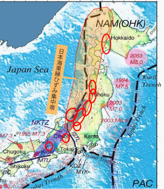 震源は、東日本がある北米プレート(板状の岩盤)と大陸側のユーラシアプレートがぶつかる境界付近にあたる。地震を引き起こす「ひずみ」が集中しやすい地帯で、北海道西部から新潟・佐渡沖に広がる「日本海東縁部」と呼ばれている。 一方、別の専門家は山形県沖から関西地方まで広がる「新潟―神戸ひずみ集中帯」で起きた地震の可能性を指摘する。 ------------------------------------------------------- 地震学はまったく役立たずの学問になっているのではないでしょうか。批判精神を失って垂れ流すだけのマスコミも機能していません。 参考: |