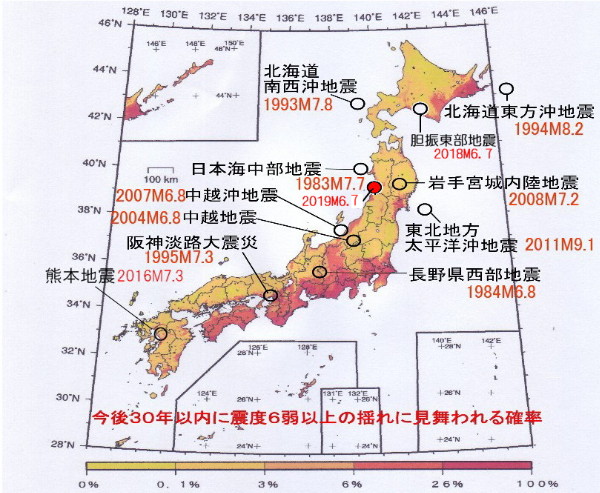 さらに、胆振東部地震もそうですが地震発生確率表では「発生確率が低いと表示されるところ」で起きています。地震発生確率表にいったいどのような価値があるのでしょうか、まったく不明です。 ![]() 発生確率が高い(赤色)地域で地震は起きていない。 地震発生理論が間違っている証拠ではないのか? ------------------------------------------------- 「ひずみが集中、地震の多発地域」 遠田晋次東北大教授 遠田晋次東北大教授(地震地質学)は今回の地震について「日本海東縁部は、(日本列島の下に沈み込む)太平洋プレート(岩板)によって地盤が東西方向に押され、ひずみが集中している。地震が多発しており、過去には北海道南西沖地震(平成5年)や日本海中部地震(昭和58年)などが起きてきた」と話す。 津波注意報が出されたことから「海底に延びる、まだ知られていない活断層が動いた可能性がある。この点は新潟県中越沖地震(平成19年)と似ている」とした上で、「今回の震源は新潟地震(昭和39年)の震源に非常に近い。何らかの関連があるかもしれない」と指摘。今後については「周辺に密集している活断層の活動に影響するかもしれない。強い地震に注意が必要だ」と警戒を促した。 新潟震度6強「数日間は警戒を」 未知の断層の可能性も 18日夜に起きた最大震度6強の地震について、名古屋大の鈴木康弘教授(変動地形学)は「日本海の海底には、海岸線に沿って活断層がつらなる変動帯があり、その中の一部で起きた地震ではないか」と指摘する。この変動帯の近くでは過去に、新潟地震(1964年、マグニチュード7・5)と日本海中部地震(83年、同7・7)が起きている。鈴木教授は「二つの地震と比べると、今回の地震の規模は少し小さいので、今後さらに大きな地震が起こる可能性は否定できない。数日間は警戒しておく必要がある」と述べた。 東北大の遠田晋次教授(地震地質学)は「日本海は、新潟県沖から北海道西方沖にかけて、断層が密集し、ひずみが集中しており、この規模の地震が起きることは想定されている」と指摘した。そのうえで、「心配されていた山形県沖の(想定される地震の)空白域とは違うようだ。現時点の情報だと、新潟地震の震源域の北端で起きたように見える。名前が付いた主要な断層ではなく、知られていない断層が動いた可能性も考えられる」と語った。 「ひずみ」集中地帯…東西から地盤押され、上下にずれる「逆断層型」