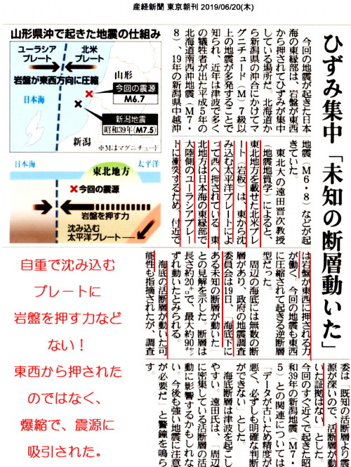 | 3117 Date: 2019-06-20 (Thu) プレート理論を基礎にしている定説地震論は矛盾だらけ 今日の産経新聞に「ひずみ集中『未知の断層動いた』」という記事がありました。内容はいろんな説の「継ぎ接ぎ論」という感じです。説得力がまったくありません。