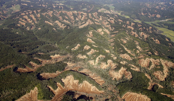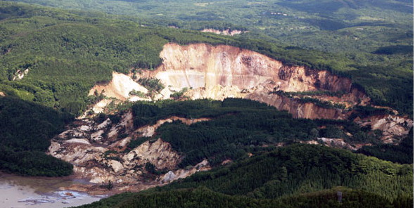 ということですが、花崗岩の石割り作業を見れば、固着している断面(石割の面)にブライトスポットがあるとは思えません。 [1248]に紹介したブログには 「中越地震でも同じような事が起きてたんです!びっくり このお話は部長が知り合いの方から直接聞いたお話なんですが、 畑の大根がピョンピョン飛び跳ねるように抜けちゃったそうです。 その光景はまるでウサギが飛び跳ねているようだったと。。。」 とあります。 地震爆発論で言えば「押し円錐軸と地表が交差する付近が最大加速度になり、石や灯篭が飛ぶ」ということになります。 地震は爆発現象であるから、飛び石が起こり、荒砥沢ダム上流の斜面崩壊(岩手宮城内陸地震)が起こり、胆振東部地震での「尾根筋以外全て崩落」という異常な光景が出現するわけです。 ![]() 押し円錐軸が斜面中腹を貫いた。大きな加速度により斜面は崩壊した。 岩手宮城内陸地震荒砥沢ダム上流の崩落現象 ![]() 胆振東部地震、厚真町での山林崩落 直下型地震で押し円錐軸が地表面と垂直に交差し、斜面上の樹木と表土が全て崩落した |