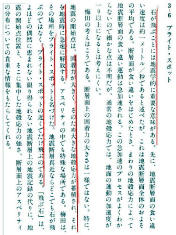| 3113 Date: 2019-06-07 (Fri) ブライトスポットという怪しげな話しで立論するのは科学ではない 地震に伴って「飛び石」や「海震」などの現象があることが知られています。([1113]、[1248]、[2787]、[3073]など参照) 素直に考えれば「地震は爆発現象だ」という結論に到達できますが、「地震は断層運動だ」という縛りがあると、飛び石現象も「ブライトスポット」上の石だけが飛ぶという怪しげな「作り話」を誕生させてしまいます。 [3104]で紹介した「サイレント・アースクエイク」の中からブライトスポットを紹介します。 ![]()