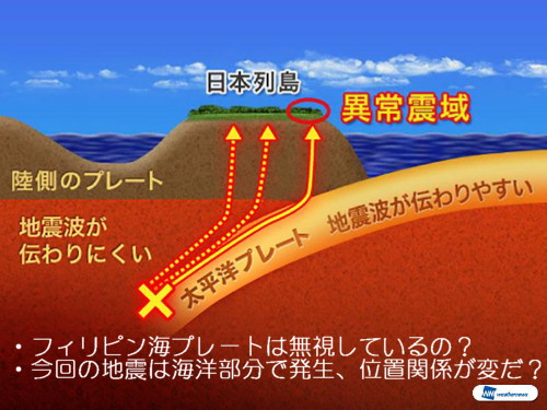 三重県南東沖で今回のような大きな深発地震が発生するのは、2003年の11月12日以来です。 また、1984年1月1日にはM7.0の地震が発生し、東京都千代田区や横浜市で震度4を観測しました。こうした地震は津波の発生こそないものの、大きな揺れを伴うことがあるため、注意が必要です。 一方今回の地震は、震源の深さが速報値で約420kmと、かなり深い地震でした。日本海溝から西に向かって沈み込む太平洋プレートの中で発生した地震とみられます。 これらの違いから、今回の地震は南海トラフ巨大地震との直接の関連は無いものとみられます。 震源から離れた地域で長い揺れを観測 ![]() 熔融マントル内の爆発(地震)による衝撃波が、地殻内に進入すれば、P波もS波も形成される。 図のような表面波も形成されるのは当然である。 今回の地震は深さが420kmですから、フィリピン海プレートといわれているプレートよりもズット深い場所での地震です。 解説によればフィリピン海プレートのはるか下方に太平洋プレートが潜り込んでいることになりますが、フィリピン海プレートの誕生場所も分からない(海嶺が無い)のですから、解説は妄想に過ぎないと思います。 プレート論は一つの仮説であり、その存在も、潜り込みも確認されたわけではありません。 地震爆発論ではPT論を否定し、地殻はモホ面の下にある第2層までと考えています。その下部のマントルは熔融しており、「深発地震面」は熔融マントルの対流する姿と考えています。 異常震域が起きるのは、熔融マントル内部の爆発震動を、地震波速度の速い地殻第2層(敏感な部分)が伝えるからです。その地殻第2層が地表に近くあるのが関東地域の太平洋側であるわけです。それが、異常震域と見られる現象を発生させている原因です。次に紹介する[1275]の解説を参考にしてください。 ![]() 深発地震面はプレートとは無関係。熔融マントルの対流である。「太平洋プレートが地震波を伝えやすい」というのは誤解である。 ![]() ![]() プレート論者に質問したい。フィリピン海プレートはどのような働きをするのか?無視していいのか? 地震爆発論では、プレートの存在は否定していますから、プレートの潜り込みも考えていません。深発地震は熔融マントル内部の対流部分で起きていると考えます。その震動が天井に相当する地殻の内部を伝播しますが、硬くて緻密な地殻第2層が遠くまで伝えます。関東の太平洋側は第2層が地表面に近いので敏感に反応しているものと考えています。 |