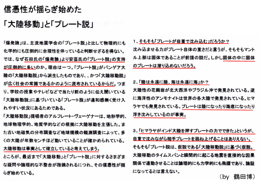| 3157 プレート論は科学的真実と思っていたが、揺らいでいる・ハフポスト掲載か ノーベル平和賞候補の環境少女とプーチン氏の応酬が話題 プーチン大統領が環境少女グレタさんの問題で「誰も彼女に世界の複雑さや多様性を教えなかったのだろう」と指摘し、彼女がツイッターで「(気候変動の影響は)現在の最善で、利用可能な科学によって証明されている」と反論したことが話題になっています。 科学は真実を教えているわけではありません。その時点で影響力のある科学者やマスコミが報道しているから信じられているだけのことです。その科学者に誰かが不正に影響力を付与しているのかも知れません。 実は[3156]に紹介した元・新聞記者鶴田博氏がHaffington誌(ハフポスト HuffPost)に載せようとされている原稿全文を送ってくださいました。 その中にも、科学的真理であると流布されている「プレート説」や「大陸移動」の信憑性が揺らぎ始めた、と言う解説があります。