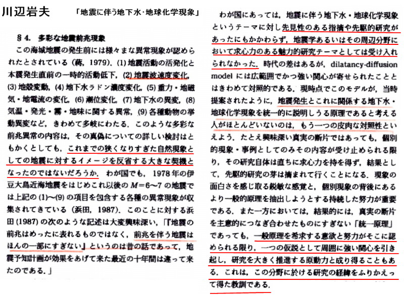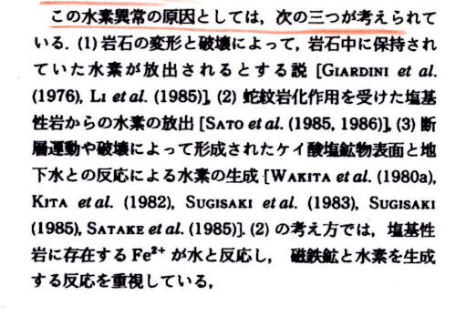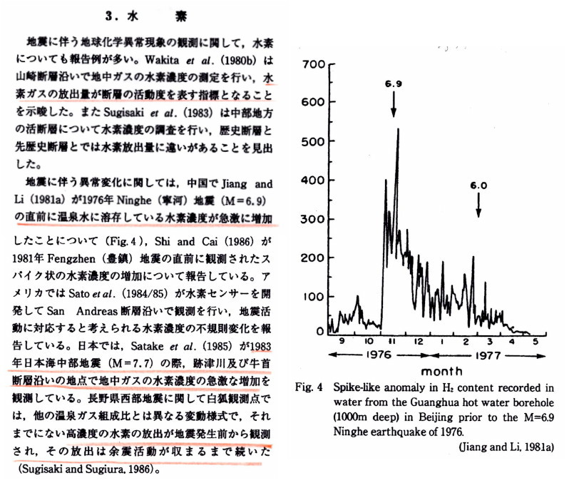| 3152 Date: 2019-09-27 (Fri) 地震時に水素や二酸化炭素が発生するのは当たり前である・地球化学地震予知を大切にしよう ある著名な地震予知研究者(小泉尚嗣氏)の「地球化学的地震予知」に関する論考を見て驚きました。地球化学的地震予知研究を以下のように説明してあります。 「地下水や地下ガス中の特定の化学成分に濃度(比)や同位体比に注目し、その時間変化と地震発生との関連を調べたり、その空間分布を調べて、プレートテクトニクスや活断層等との関連を調査したりすることが地球化学的地震予知研究である。」 これではプレートテクトニクス理論を否定する研究成果など出てくるわけがありません。プレート論が完全に正しいものとして化学的地震予知をも拘束しています。このために、地震爆発論ならば意味を持つ素晴らしい研究成果が意味を持たなくなってしまっているのは残念です。 ある研究者の言葉にも 「日本では1970年代後半から1980年代にかけて地震に伴う地球化学異変現象に関心が集まった時期があった。しかしながら、明瞭な異常現象を捕捉できずに観測から撤退してしまい、現在(1996年)も継続している研究者は多くない。このことは地球化学異常現象に対する理論的考察の不足から、現象論以上に研究を深化できなかったためと考えられる。今後さらなる地球化学観測データも蓄積とともに、異常現象の理論的解釈を進めることが、この分野の研究の発展に不可欠であろう」(永井康一郎『地震に伴う地球化学異常現象の観測』より) とあります。小泉氏の記事の最後にも「地球科学的地震予知研究の弱点である理論面の充実に努めることが大切であろう」と書いてあります。 永井氏の記事にある「1970年代後半から1980年代にかけて地震に伴う地球化学異変現象に関心が集まった時期」というのはScholzの「ダイラタンシー理論」が出現した時期ですが、ショルツ理論は否定されてしまって、地球化学的研究は理論的根拠を欠いたままの状況になっています。 [3151]に紹介したIEEEで講演した『地震発生機構の新しい考え方』は「熱解離した水(水素と酸素)が再結合するときの爆縮現象が地震の正体である」とするものですが、この理論ならば、地球化学異変現象を完璧に説明することができます。断層で水素が観測されることも、炭酸ガスが観測されることも無理なく説明ができます。([521]、[2651]など参照) 講演の予稿集には、山ア断層で高濃度の水素観測例を載せていますが、そのほかにも、水素濃度の観測例を紹介します。 ![]() 『活断層より放出されるガス(2)水素について』杉崎隆一等による 下段の7点は地震発生が知られていない過去に生成した断層です。 歴史断層ではまだ活発なマグマ活動が地下にあるわけですから、解離現象が継続していて、水素が発生していることは容易に推定できますが、古い断層では地下のマグマ活動も衰退していることが想定できます。 断層を離れた場所での水素濃度の観測例もあります。 長野県西部地震(1986年 震源は御嶽山麓)が発生したときに、震源から南南西50km付近にある白狐温泉(瑞浪市)において、水素濃度の異常な増加が記録されています。 ![]() 長野県西部地震において白狐温泉(岐阜県瑞浪市)で観測された水素濃度の異常 『地震に伴う地下水・地球化学現象』川辺岩夫より IEEE講演でも紹介しましたが、水素濃度の観測は中国で活発に実施されていて、長野県西部地震での様な水素濃度の異常観測が報告されています。(川辺岩夫『地震に伴う地下水・地球化学現象』参照)。 次図は永井氏の論文にある記述と図面を参考のために転載させていただきました。 ![]() 永井康一郎『地震に伴う地球化学異常現象の観測』より しかし、水素やCO2の発生原因に関して説得的で明快な解釈が得られていませんので、「原因が不明なものは非科学的だ」という『測地学的地震予知研究者』(この勢力が既得権を持っているのが現状です)の一声によって日陰に追いやられているのではないでしょうか。 地震学を進歩・発展させて地震予知手法を確立するためには、『地震爆発論」を取り入れて、此の体制を打破しないといけません。 巨大地震では水素だけではなく酸素や過熱蒸気としてのH2Oも断層を通して噴出します。これが大火の原因になることを『肝に銘ずる必要』があります。 地震爆発論から見れば、現在の防災対策はまったくピントハズレということになってしまいます。 追記: 水素の発生する原因について地震爆発論は「熱解離現象」としていますが、川辺氏の論文には次のような見解が述べられています。 ![]() 『地震に伴う地下水・地球化学現象』p.360より |
