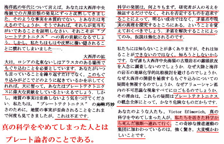 ベロウソフ教授がエフィモビッチ教授に「潜り込みが何処でどのように起きているのかを示してくれ」と言っている内容です。 プレート論を信仰している人には、疑問にならないのでしょうか、不思議でなりません。 [3158]に紹介した鶴田氏の論稿には「石田氏の「爆発論」が学会内に広まりにくい理由は、石田氏が大陸移動を完全否定していることにあると思われる」と書いてあります。 「大陸移動の証拠・原動力がない、原動力を説明してくれたら、PT論者よ、天に誓って、あなたはプレートテクトニクスに偉大なる貢献をしたといえるでしょう」 と、ベロウソフ教授のような言葉を残しておきます。 |
