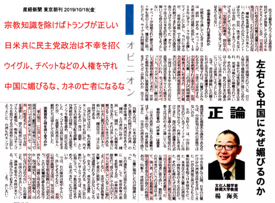 | 3165 Date: 2019-10-18 (Fri) 中国の独裁体制に媚びる日本の姿勢は中国人の幸福に繋がらない 楊海英氏が「左右とも中国になぜ媚びるのか」と産経新聞オピニオンで述べています。 全くその通りだと思います。