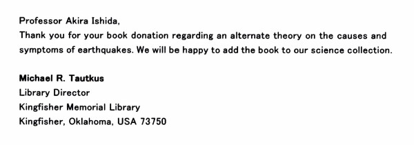 | 3250 Date: 2020-02-27 (Thu) 未来社会では「諸学の統一」が起きるだろう 拙著「The cause of the earthquake is not active fault, but is Hydrogen Implosion」 を英語圏に献本しましたが、オクラホマの図書館から「Your book about earthquake implosive detonation theory」との標題で御礼のメールが届きました。