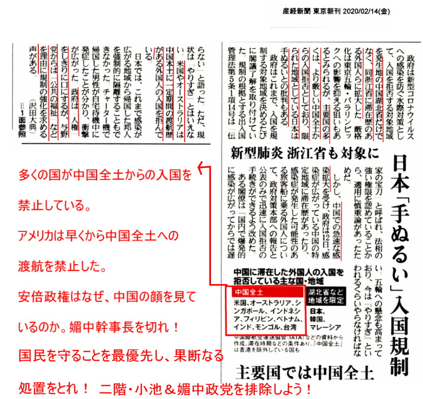 | 3246 Date: 2020-02-22 (Sat) 時代は変革期を迎えていることを早く覚ろう!苦難が大きくなる前に 遠藤誉氏も「コロナウイルス感染拡大防止の失敗は習近平国賓訪日への忖度が招いた」と述べています。 抜粋して紹介します。 ーーーーーーーーーーーーーーーーーーーーーーーーーーーーーーーーーーーーーーーーーーーーーーーーー ◆湖北省だけを対象とした、安倍政権の初動のまちがい 安倍首相は1月31日、新型コロナウイルス肺炎の日本における感染拡大を防止すべく、対策本部の会合を開き、「前例にとらわれた対応では前例なき危機に対応できない」と述べた。しかし中国からの渡航者に関してその時点では湖北省からのみを対象としており、中国の他の地域からの渡航者に関しては制限を設けていなかった。 ところが日本における感染の拡大を受け、安倍首相は2月12日になってようやく浙江省での滞在歴などを入国拒否の対象に追加することを決め、13日から実施し始めた。安倍首相は「感染症の流入を食い止めるため、より包括的かつ機動的な水際対策を講じることが不可欠だ」と言ったようだが、遅すぎる。 1月23日に武漢を封鎖した時点で、新型肺炎発生以来、500万人の武漢市民が武漢から脱出しており、感染している可能性のある人は既に中国全土に散らばってしまっているからだ。 ◆習近平国賓招聘への忖度 1月30日にWHOが緊急事態宣言を出しておきながら、習近平ベッタリのテドロス事務局長が緊急事態宣言の時に付随するはずの「当該国への渡航と貿易の禁止」を「除外」したものだから、日本はそんなWHOに足並みを揃えているようだが、アメリカなどは自国民以外の中国からの入国者は全て拒否しており、アメリカ国内での伝染拡大を確実に食い止めている。 それに比べて日本は2月12日まで湖北省だけしか対象としていなかったので、中国の他地域からの観光客などは自由に日本に入国していたわけだ。 そこで中国政府はアメリカの対応を「非常に非友好的である」として強く非難する一方、日本は「非常に友好的な国」として絶賛の嵐を送っている。 たとえば2月7日、自民党の二階幹事長が公明党の斎藤幹事長と共に東京にある中国大使館を訪れ、中国に新型肺炎への対応に関して(経費的などの)支援を申し出ただけでなく、中国が新型肺炎と実によく闘っていると、WHOのテドロス事務局長並みに習近平を褒めそやした。 そのため、中国の中央テレビ局CCTVでは連日このニュースをくり返し報道した。特に二階幹事長が孔鉉佑・駐日中国特命全権大使に「隣国であるだけに、隣の家で何か起こったのと同じことだ」と言ったその場面をクローズアップしていた。 ジャーナリストの田原総一朗氏は、以前からその二階氏に、習近平の国賓来日を含め、中国と仲良くした方がいいと盛んに勧めたと筆者との対談で仰っていたが(『激論!遠藤vs.田原 日中と習近平国賓』に所収)、中国はこういった親中派を育てることには非常に長けている。 二階氏の中国絶賛という一連の流れの中で、中国政府は2月15日、王毅外相にドイツのミュンヘンで開催された第56回ミュンヘン安全保障会議において茂木外相と会談させ、習近平の国賓としての4月来日に関して「これまで通り実行する」意思確認を行わせている。 ーーーーーーーーーーーーーーーーーーーーーーーーーーーーーーーーーーーーーーーーーーーーーーー 二階氏にせかされた茂木外相は21日の会見で「習氏来日準備を加速する必要がある」と述べています。