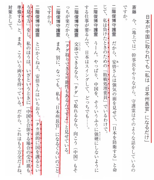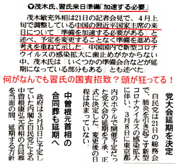 | 3249 Date: 2020-02-26 (Wed) 晩節を汚す総理、工作に嵌る幹事長、宇宙からの介入 武漢肺炎が蔓延して、国民が悲鳴を上げていると言うのに、日本政府は未だにアメリカや台湾のような中国全土からの入国禁止措置を取っていません。中国全土を対象にすれば習近平国家主席が訪日できなくなるからでしょう。 一体、自国民の生命保護よりも中国への外交配慮を優先する理由とは何なのでしょうか? 一説には沖縄返還を成し遂げた佐藤栄作のような「大宰相」と言われるような業績を上げておきたいという名誉心があると言われています。 国土防衛に関して功績もあるのですが、以下のような報道を見ると、「晩節を汚す」危険性のほうが高いのではないでしょうか。 古森記者の記事を紹介します。 ーーーーーーーーーーーーーーーーーーーーーーーーーーーーーーーーーーーーーーーーーーーーーーーー 新型肺炎で世界に知れわたる安倍政権の中国への忖度 「日本の安倍晋三首相は新型コロナウイルスとの正面対決よりも、習近平主席の訪日を前にして中国の気分を害さないことに神経を使った」 米国の有力紙ワシントン・ポストが2月20日付の記事でこんな見解を報道した。 同記事はこう指摘する。中国で新型ウイルスの感染が拡大したことが明白になった後も、日本政府は中国からの旅行者などの入国を許した。それによって、日本国内での感染が広がった。その大きな“原因”は、安倍首相の習近平主席の国賓来日への「忖度」である──。 「日本政府の対応は遅く間違っていた」 「クルーズ船の新型コロナウイルス感染に関する日本の対応は『完全に不適切』だと衛生専門家が言明」という見出しのワシントン・ポストの記事は、日本政府のクルーズ船への対策を批判しながら、日本への感染の危険が明白となってからも中国からの来訪者多数の入国を認めていたのは、習近平政権への過剰な配慮による失敗だと指摘していた。これは、米国の他のメディアや専門家たちの間で一般的な見方だという。 ワシントン・ポストのこの記事はサイモン・デニヤー東京支局長によって書かれた。デニヤー支局長は同紙の中国やインドの支局長を務めたこともあるベテランの国際報道記者である。 デニヤー氏は、安倍首相や日本政府の新型コロナウイルス問題への対応やその意味について、まず以下のように伝えていた。 ・2月17日頃に日本で報じられた2種類の世論調査によると、安倍政権への支持率が5ポイントも低下し、同政権の新型コロナウイルスへの対応への国民の不満が高まっていることを示した。 ・すでに停滞気味の日本の経済は新型コロナウイルスによって破壊的な打撃を受ける。今年夏の東京オリンピックへの影響も測り知れない。 ・新型コロナウイルスは猛スピードで広まったが、多くの専門家たちは日本政府の対応は遅く間違っていたと述べている。 デニヤー氏はまず以上のような総括を述べたうえで、日本政府の不十分な対応についてさらに具体的に以下のように記していた。 ・日本政府は1月23日に、中国から日本に到着した旅行者たちの体温を測定する器具を使用し始めた。だが、ウイルス感染が始まった湖北省からの来訪者の日本入国を禁じる措置は2月1日までとらなかった。米国政府はすでにその前日の1月31日から、過去2週間以内に中国に滞在していたすべての外国人の入国を禁じていた。 ・その結果、その時点までに日本には湖北省からの旅行者がすでに数千人も入国していた。そのなかには明らかにウイルス感染者たちが含まれていた。 ・2月4日までに、明らかに日本国内では新型コロナウイルス感染が広がっていた。たとえば同日までに日本国内で休暇旅行をしたタイ人の夫妻が同ウイルスに感染して、タイに帰国していた。 世界に報じられる安倍政権の中国への忖度 以上のように同記事は、米国など他の諸国の政府が中国からの来訪者の入国を禁止する措置をとっていたのに対して、日本政府はウイルス発生源の武漢市のある湖北省からの来訪者を無制限に入国させ、中国全土からの来訪者に対する制限などを行わなかった点を強調する。そして「安倍首相は新型コロナウイルスとの正面対決よりも習近平主席の訪日を前にして中国の気分を害さないことに神経をより多く使ったと考察者たちは述べている」と総括していた。 同記事では、そんな考察者の1人として、米国テンプル大学日本校のジェフ・キングストン・アジア研究部長の「日本政府は、俊敏に適切な対応策をとってウイルスの爆発的な拡散に備えるべきだったのに、驚くほどゆったりと構えていた」という言葉を紹介していた。 同記事は全体として、安倍首相は今年(2020年)4月ごろに計画される習近平国家主席の日本への国賓としての来訪に気を遣い忖度した結果、中国側の気分を害する中国全土からの来訪者の日本入国の禁止や規制という措置をとらなかった、と述べている。 安倍政権の外交レベルでの中国への遠慮が、新型コロナウ