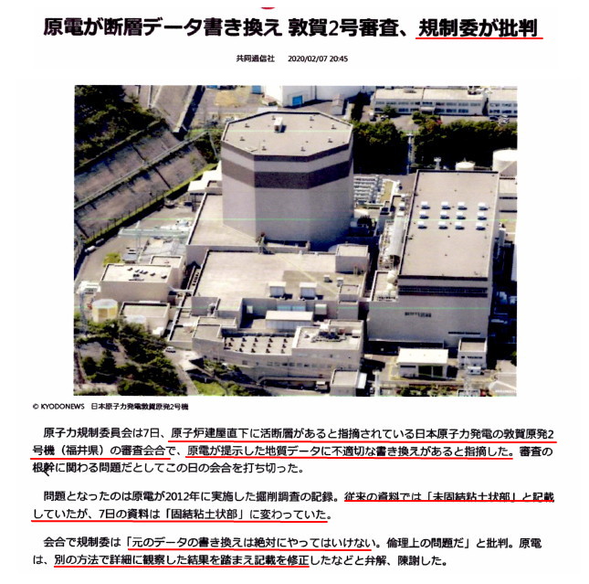 | 3231 Date: 2020-02-08 (Sat) 国家の運営を間違うと日本は二流国になってしまう、原子力規制委員会を改正しよう 新聞報道には見えませんが、昨日の敦賀原発2号炉の審査会が流れたそうです。原子炉直下に活断層があるかどうかの問題で、資料の訂正があったことを規制委員会が問題とし、会合が開催されなかったと共同通信が報じています。
