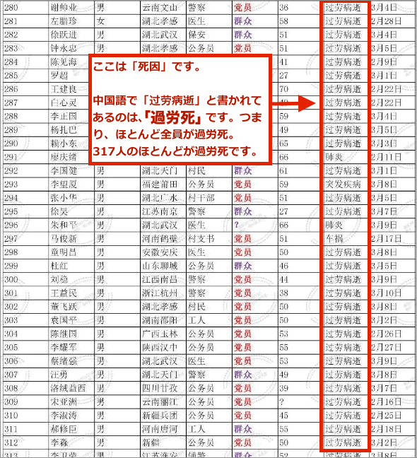 投稿日:2020年3月15日 3月10日に、武漢に習近平主席が訪問したと報じられていますが、3月12日というのは、その翌々日です。習主席が訪問した2日後に、再び湖北省を封鎖したということになるようです。 また、中国政府は、新たな患者が減少したとして、武漢に建てた臨時病院をすべて閉鎖したと発表していますが、現在、遼寧省錦州市という場所に「新たな臨時病院」を建設していることが報じられていました。 錦州市には、同じように建設中の病院が少なくとも他に3つあるようです。 同じ報道では、武漢の人たちの話として、閉鎖した武漢の臨時病院を退院した人たちの多くは完治しておらず、ウイルスを持ったまま病院から出されたと述べています。 つまり、感染したまま日常に戻ったことになるようです。武漢の人は、これがまた新たな大規模感染につながるのではないかと懸念しているようです。 中国共産党は、ビジネスを含めた「経済活動の復帰」を熱望しているために、数字上は、感染者が減少し続けており、ついには、本日のように「新たな感染者数はいなかった」としましたが、実際には、流行は収まっていないようです。 なお、こちらの報道では、武漢では、すでに「感染者がいなくなったので、新型コロナウイルス検査そのものを中止した」とあります。 つまり、現在の武漢は検査そのものをしていないので、「今後、武漢から数字として感染者が出ることはない」ことになり、新たな感染者は「 0 」のまま推移しそうです。 中国政府が強引に経済活動を再開した場合、感染の第二波が襲ってくる可能性もあります。 ーーーーーーーーーーーーーーーーーーーーーーーーーーーーーーーーーーーーー [3256]で紹介したように、R・A・ゴールは「数はそうとう、天文学的な数になると思う」と述べています。 スペインかぜでは世界中で5000万人以上が亡くなりました。ペストでは、「ヨーロッパ全体での犠牲者は、総人口の3分の1とか4分の1と言われているが、正確な数字は不明」とされています。3月15日の統計で中国の死者数が3千名というのは特定の病院で亡くなった使者の数だと思われます。自宅で亡くなった人などはカウントされていません。