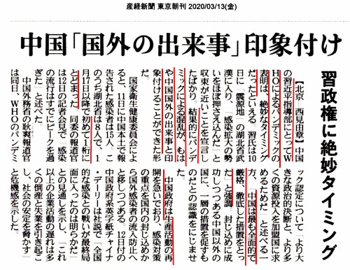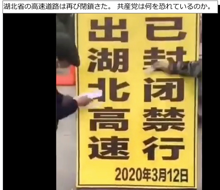 | 3263 Date: 2020-03-15 (Sun) やはり中国の新型コロナウイルスの感染は終息していない やはり、武漢の感染は終息していないようです。 習近平氏が武漢を訪問したのが10日ですが、12日には武漢の高速道路が再び閉鎖されました。武漢では感染が終息したとして、検査そのものを中止してしまっています。それで新規の感染者はゼロだということに過ぎません。再度の爆発的感染が進行しているようです。 ーー ーーーーーーーーーーーーーーーーーーーーーーーーーーーーーーーーーーー ![]()