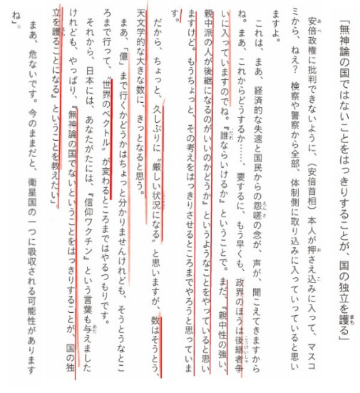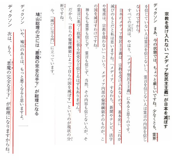 | 3252 Date: 2020-02-28 (Fri) メディア内部の倫理綱領そのものがこの国を滅ぼす危険が迫っている 国政への関与をこれ以上遅らせては「手遅れになる」という判断の下に、小生も含めて全国で300名以上の候補者を幸福実現党が擁立したのは2009年の衆院選でした。 誕生したのは民主党の鳩山政権でしたが、翌年2010年6月1日の霊言で、霊人ジーン・ディクソンは「鳩山の後はもっと悪くなる」と語り、菅直人総理(6月8日政権誕生)を「悪魔の完全な手下」と見て、悪魔の政権誕生を予言しました。 「失われた20年」と言う言い方がありますが、自民党が政権を取り戻した後半になっても、ジーン・ディクソン氏の予想したままの社会が続き、ついに「コロナウイルス禍」で日本社会は沈没するかのような状況にあります。 現今のマスコミ報道を見ていても、根本的に何が間違っているのかを指摘する言論人が見当たりません。10年前のディクソン女史の霊言の一部を紹介します。 ![]() 霊人ジーン・ディクソン女史の2010年6月1日の警告 日本のエネルギー安全保障を混乱させている「原子力規制委員会」は菅直人政権が作ったものです。この霊言が書籍にもなっているのに、自民党政権は「悪魔の手下が作った三条委員会」という強力な「癌細胞」を摘出する決断を下せないでいます。 菅直人は「政権が移っても簡単には原発が稼動できない仕組みを残した」と北海道で語っています。 コロナウィルス禍がひどいのは左翼の強い北海道、二階氏の出身地和歌山、知事が左翼思想の愛知県、などなど、何か地球の主治医の処方箋が降りているような雰囲気を感じます。 「メディア内部の綱領そのものが、この国を滅ぼすわけですね」との言葉が現実味をもって響いてきます。 ムーが沈んだときにも同じような警告を大衆は無視したようですが、今はムーの存在さえも科学的にありえないとして無視しています。 人類は同じ過ちを繰り返してきたようですが、「頭の切り替え」をしないと、また同じ過ちを繰り返します。 コロナウィルス禍を機会に、マスメディアの担当者に良く考えて欲しいものです。 [2885]参照 ----------------------------------------------------------------------------- 原発ゼロに向けた民主党の工程表は、自民党政権に代わり白紙に戻されました。「トントントンと元に戻るかといえば、戻りません。10基も20基も再稼働するなんてあり得ない。そう簡単に戻らない仕組みを民主党は残した。その象徴が原子力安全・保安院をつぶして原子力規制委員会をつくったことです(中略)独立した規制委の設置は自民党も賛成しました。いまさら元に戻すことはできない」 — 「北海道新聞」2013年4月30日19面、特集『幻の原発ゼロ』 |