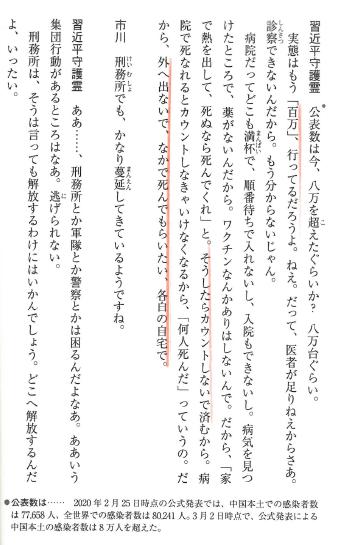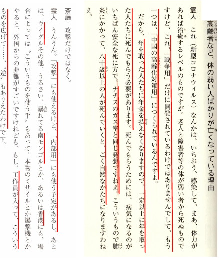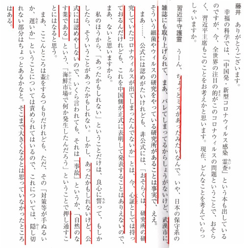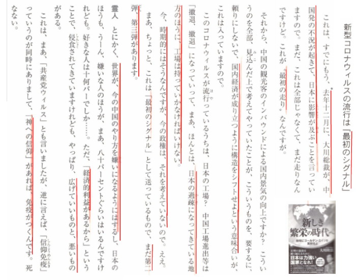 1月3日: 中国に巨大なシンクホール(つまり瓜生島の沈没のような)でも発生すれば、工場引き上げも決断できるのかもしれません。 ![]() 「中国発・新型コロナウィルス感染霊査」p.60-p.65より 媚中のWHOは武漢ウイルスをCOVID-19という分けの分からない名称にしていますが、霊人は「共産党ウイルス」だと断定しています。その使用目的は国内向けで、「中国版少子高齢化化対策」(恐怖の人口減・アウシュビッツ)だと、最新の習近平霊言では語られていますが、そんな国を擁護したり、好きになる人はどうかしています。 しかし、「神への信仰」があれば「信仰免疫」がつくので、「死なない」そうです。 つまり、根本的な解決は[3250]に紹介した霊人エドガー・ケーシーが言っているように「今、救世主が地上に誕生している」ことに気付くことであると思います。 困難はまだ続くでしょうが、その後には「日本のゴールデンエージ」が来ることを信じたいと思います。宇宙的霊人R・A・ゴールは「救世主のいる日本を守る」と述べてくれています。それを信じたいと思います。 参考:遠藤誉女史も中国全面入国規制が決断できない安倍政権の「国家統治能力」と題して安倍政権を厳しく批判しています。
