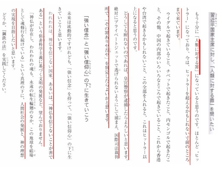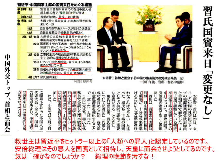 | 3253 Date: 2020-02-29 (Sat) 習近平を国賓招待したいが為の小中高の休校か? 安倍総理は全国の小中高の休校を指示し、「首相らしい決断を示してくれた」という評価も一部にはあります。しかし、本当に国民の命と健康を守るための決断なのか、疑問に思うところもあります。 産経新聞には、「習氏国賓来日「変更なし」」との記事があり、中国の外交トップとの面会記事が載っています。 ![]() 「これから、香港や台湾で起きること(コロナウィルス禍が起きなければ、中国の攻撃が予定されていた)、この全部を入れると、これはヒットラー以上になると思うのです。」という文章の続きをも紹介します。 ![]() 「新しき繁栄の時代へ」p.116-119より 霊人R・Aゴールは「エルカンターレという救世主をなめている」、と語っています。その付けは払わなければいけなくなるでしょう。 ところで、リバティーWebでは習近平の最新の霊言を以下のように伝えています。 ーーーーーーーーーーーーーーーーーーーーーーーーーーーーーーーーーーーーーーーーーーーーーーーーー 中国・習近平主席の守護霊「コロナ感染者は100万超」「国賓来日は日米安保の破棄が目的」と言及 コロナ問題で習氏は、対策の陣頭指揮に当たっているわけではない。同氏が腹の内では何を考え、どのような心境にあるかは分からない状態と言える。 そうした中、大川隆法・幸福の科学総裁は26日、習氏の守護霊が日本に直接メッセージを届けたいとして、同氏の守護霊霊言を収録。中国の最高指導者の「本音」が明らかとなった。 「感染者数は100万を超えた」 現れた習氏の守護霊は、コロナ問題が湖北省武漢市でとどまると思いきや、いまだに収束する気配がないため、終始「悩乱」している様子を見せた。 守護霊は、新型コロナがどこから発生したかについて、「公式には認め難いけれども、非公式では恐らく、(武漢の)研究施設のコロナウィルスが外に出てしまったのではないかと、今の心証として思っている」と指摘。なぜあっさりと施設から漏れた可能性を認めたかと言えば、隠し通すことは難しいためであり、いずれ露見するからだとした。 中国政府は現在、国内の感染者数を約8万人と発表している。これについても習氏の守護霊は、首都・北京を含めて相当な感染者が出ているとして、こう述べた。 「実態はもう100万行ってるだろうよ。だってもう医者が足りねぇからさあ。診察できないんだから。何も分からないじゃん。病院だってもうどこも満杯で、もう順番待ちで入れないし。入院もできないし、病気を見つけたところで薬ないんだから。ワクチンなんか、ありゃあしないんで。だから、家で熱を出して、死ぬんなら死んでくれと、そしたらカウントしないで済むから」 対日政策は「日米安保の破棄」が狙い コロナ問題をめぐっては、習氏の国賓来日が実現するか、または延期・中止になるかが焦点の一つとなっている。同氏の守護霊は、来日目的には日本が中国に屈服したというイメージを国内外に知らしめる企みがあることを明らかにした。守護霊はこう指摘する。 「日本の天皇皇后両陛下が、(中国に)ひれ伏してるところをお見せしたいと思うから。(中略)天皇皇后両陛下が、わしの前でお辞儀して頭を下げるところを、中国では特にそこを重大視して放送をかけるつもりではおるからな」 その上で、日本経済の対中依存度を高め、ゆくゆくは「日米安保の破棄」に追い込む狙いがあることに言及。習氏の守護霊は、「安倍さんは完全に、トランプさんと私らの中間で、天秤をかけとるじゃないか。トランプさんは『面白くないと思ってる』と思うよ。だから、日米安保がいつまでもあると思っちゃあいけないよ?」と語った。 中国が日本に急接近している背景に、日米安保を破棄させ、日本を侵略する環境を整備するという、恐ろしいシナリオがあることが判明した。やはり、中国からの入国制限を設けて日本国内の感染拡大を防ぐだけでなく、中国に進出した日本企業の国内回帰などを促し、対中依存を下げることが重要だろう。 ーーーーーーーーーーーーーーーーーーーーーーーーーーーーーーーーーーー 救世主の存在があるから得られる情報を、無視したり、小馬鹿にすることは国家をひいては世界を滅亡させる危険があることを忘れてはならないと思います。 |