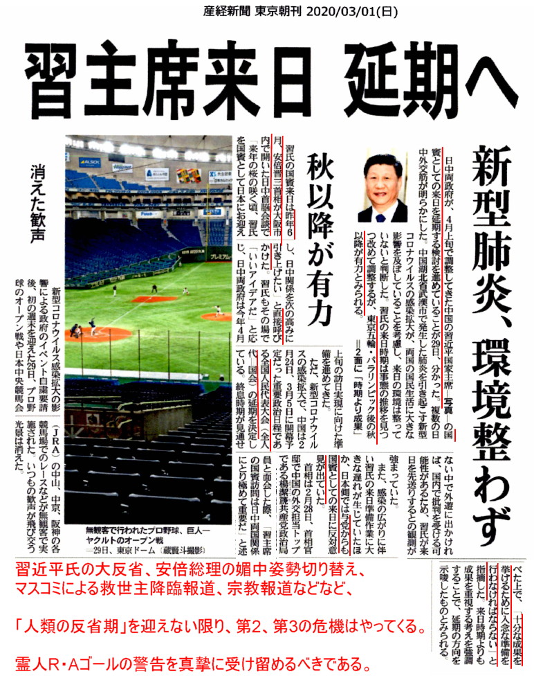 | 3254 Date: 2020-03-01 (Sun) 地球的な難局を切り抜ける基本的な方法 習近平主席来日が延期になると報道されています。秋以降が有力とありますが、政権はことの本質が見えておりません。媚中姿勢を正すことが先決です。 コロナウィルス禍は中国全土に広がって、習近平氏のいる北京でも大混乱になっています。なぜ中国全土からの入国禁止にしないのでしょうか、国技の大相撲は無観客で行なわれるというのに、政府の姿勢は思考停止状態です。