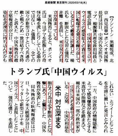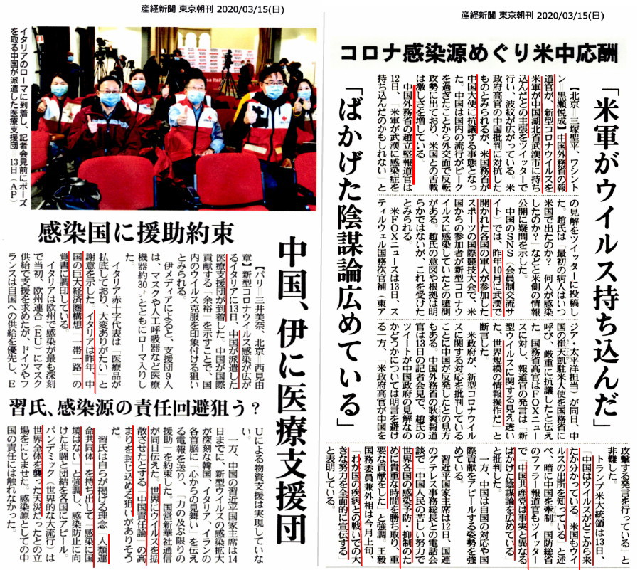 | 3262 Date: 2020-03-15 (Sun) アメリカの原因にする、まるで節操のない中国の口撃 すでに[3225]で中国が生物兵器を開発している話を紹介しましたが、中国は「武漢ウィルスは中国人を対象にした生物兵器だ」としてアメリカに嫌疑を掛けています。アメリカは勿論「バカげた陰謀論を中国は広めている」と抗議していますが、中国は、「感染源の責任」を逃れるためにイタリアに医療支援団を送ったりしてあせっています。 「反省できないだけでなく、「虚偽」を捏造する傾向」は鉄面皮のように固まってしまっています。([3260]参照) 中国の発表には何度でも反論しておかないと、マスコミ報道しか知らない国民は、騙されてしまいます。
