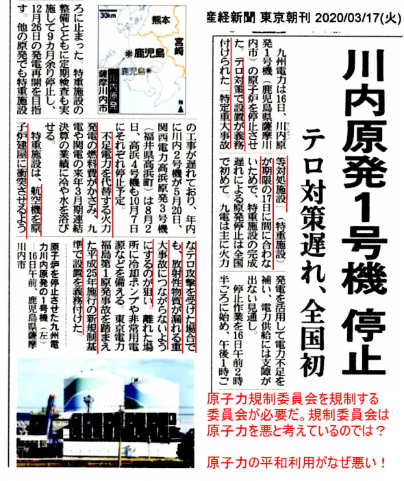 | 3264 Date: 2020-03-17 (Tue) 原子力規制委員会は法律の遡及で原発を停止させている、本当にそれでよいのか? 川内原発1号機が停止しました。 テロ対策として設置された「特定重大事故等対処施設」に適う改修が間に合わないからです。