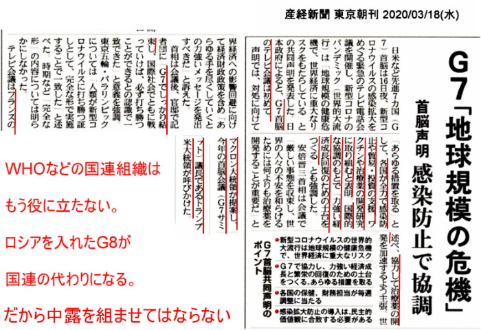 | 3266 Date: 2020-03-18 (Wed) アメリカは本当に怒っている、軍事行動も辞さないだろう 鳴霞情報によると、新たに武漢市で1300人の感染者がでたそうです。 武漢で新たに1300人の感染者!/ アメリカ国防省で37人が感染/南シナ海に米空母機動部隊が配置! 経済活動再開のために、「終息宣言」をしただけですから、感染の終息など、まったくの嘘です。今後大変な災禍を生むことになるでしょう。 ウソ八百の中国が常任理事国である国連はもう機能していません。それに代わってG7が結束を固めて戦っていくようです。本当はロシアを復帰させてG8にするのが良いと思います。