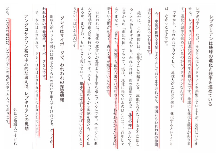 | 3275 Date: 2020-03-26 (Thu) 宇宙存在者にも進歩の差があることを知って交流する時代が来る [3271]で、中国をレプタリアン国家だと言いましたが、国家指導者を良くないレプタリアンが指導しているという意味です。民衆には善なる宇宙人の指導も入っていることでしょう。 2010年に出版された「宇宙人との対話」には、3章で「レプタリアン(マゼラン星雲ゼータ星人)との対話」が載っています。レプタリアンは地球の進化と競争を進めている、と延べ、進化に役立つ善なるレプタリアンも居るのだとコメントしています。一部を紹介します。 ![]() 『宇宙人との対話』p112−119より 中国の指導者を操っているのは邪悪な狙いを持っています [2820]で紹介した「尋問されるエイリアン」とR・A・ゴールとの差があり過ぎますが、前者はサイボーグ(グレイ)であって、レプタリアンが作った偵察用生き物(?)のようです。 グレイを宇宙人と認識するレベルよりも、R・A・ゴールやアリシアとコンタクトできる日本のレベルの方が格段に進んでいることがわかります。幸福の科学の霊査では500種類もの宇宙存在者が地球に来ているそうで、太古から地球文明に介入してきた主流派が幸福の科学を支持しているそうです。 こうした話がオカルト扱いや拒絶反応なしに語れる時代を迎えたいものです。それがやがて来る新時代でしょう。 |