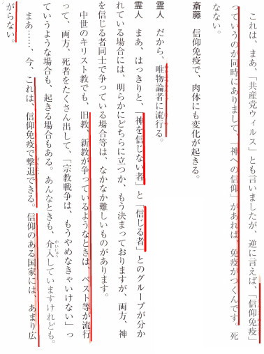 ドイツ、フランス、スペイン、スイス、英国、および米国。これらはすべて感染者数でイタリアと同じ右肩上がりの軌跡をたどっている。 ---------------------------------------------------------------------- 日本と同じことをすべきだ、と言っていますが、それは何でしょうか。 R・A・ゴールのE「親中思想への警告」という霊言を拝聴すると、 「日本のほうは幸福の科学(HS)が頑張っているので、そんなに大きなところまで広がることは無いと思っておりますが、現政権に対しては一定の天罰はある。マスコミがHSを無視しているのもよくないことだ」 というコメントがあります。 救世主の下生を信じて「地上ユートピア建設」に邁進しているHSの活動が宇宙存在者には唯一の光に見えるのではないでしょうか。 「中国発コロナ・ウィルス感染霊査」の中でも、([3254]参照) 「「神への信仰」があれば、免疫がつく、信仰のある国家には、あまり広がらない」 と言って、「信仰免疫」という言葉を使っています。 しかし、恐らく「では、なぜバチカンのあるイタリアで感染が広がるのか?」という疑問がわくでしょう。韓国の感染もキリスト教系の新興宗教内で起こっています。 その答えは、キリスト教も「宗教の黄金律」が分からなくなってきているというところに原因があるようです。 日本は衛生観念がしっかりしているとか、その他の要因もあるでしょうが、この際「信仰免疫」という概念を日本から発信すべきだと思っています。 「この時期に、ユートピア推進活動とか、宗教活動を平然と行なっていたという事実が後になって輝いてくるのです」というアドバイス(R・A・ゴールの「宇宙的救世主への道」)も宇宙存在者からありました。 日本のマスコミや言論人には勇気が無いからかも知れませんが「幸福の科学」も「オーム真理教」も新興宗教という括りでしか扱えないようです。 幸福実現党釈党首と対談した用田氏([3268]参照)は「自分は判断できないが、最初はみんな新興宗教だよね」と述べています。 皆様には、もう一段踏み込んで「宗教の黄金律」の輝きを発見してほしいものです。 |
